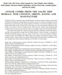Luik, H.; Peets, J.; Ljungkvist, J.; Maldre, L.; Maldre, R.; Allmäe, R.; Muñoz-Rodríguez, M.; McGrath, K.; Speller, C.; Ashby, S. (2020). Antler combs from Salme ship burials: find context, origin, dating and manufacture. Estonian Journal of Archaeology, 24 (1), 3−44. DOI: 10.3176/arch.2020.1.01.