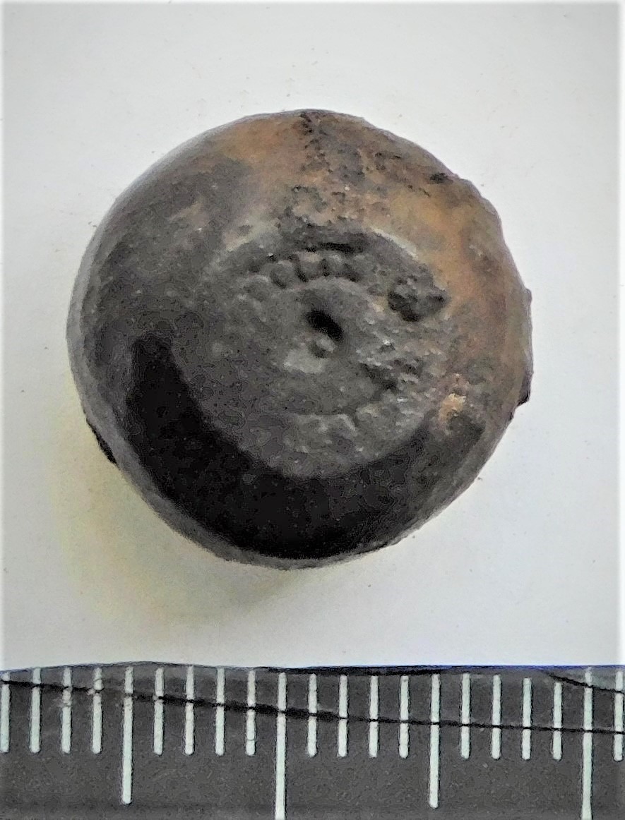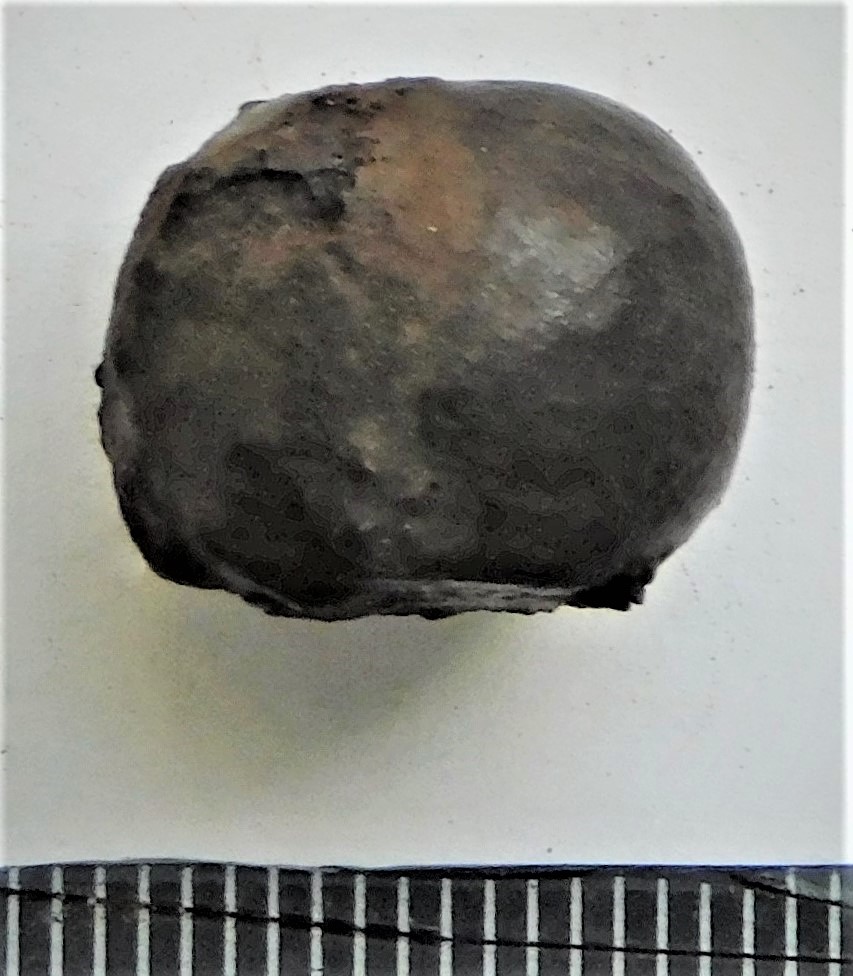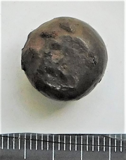 Kaaluviht, kerakujuline, raud + pronks. Otstel sõõrikestest joonest ornament.