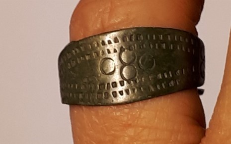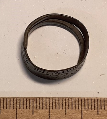 Õhukese laieneva keskosaga sõrmus, hõbe. Sarnaseid sõrmuseid on leitud Eura Luistari ja Saramäki matustest Soomes, kus need dateeritakse 11. sajandisse (Lehtsalo-Hilander 1982, 124–126) ja Abelnieki matustest Lätis, kus need dateeritakse 11. sajandi II poolest kuni 13. sajandi alguseni (Vasks 2008, 157–158). Lisaks leidub selliseid sõrmuseid Ojamaal, kus need on dateeritud 11.-12. sajandisse (Thunmark-Nylen 1998, Tahv. 143; 2006, 158). Saaremaal on samasugune sõrmus leitud Valjala kirikaiast 13. sajandi või 12. sajandi päris lõpu kontekstist.