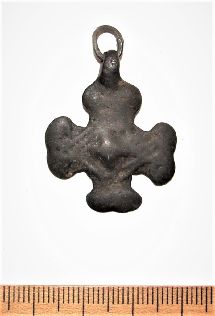 Ristikujuline ripats. Tuuli Kurisoo tüpologiseeringu järgi alatüüp B1.5.1, milliseid on muuhulgas leitud peamiselt 13. sajandisse kuuluvalt Pada laibamatustega kalmistult (nt. matus XXV). Haruldane alatüüp, mida seni on leitud vaid Eestist (Kurisoo 2021, 62-63).