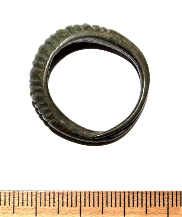 Pakseneva keskosaga põiki soonitud sõrmus, pronks. Väga levinud sõrmuse tüüp Eesti saartel, mida leitakse nii põletusmatustega kivikalmetest kui ka laibamatustest.