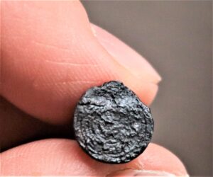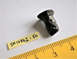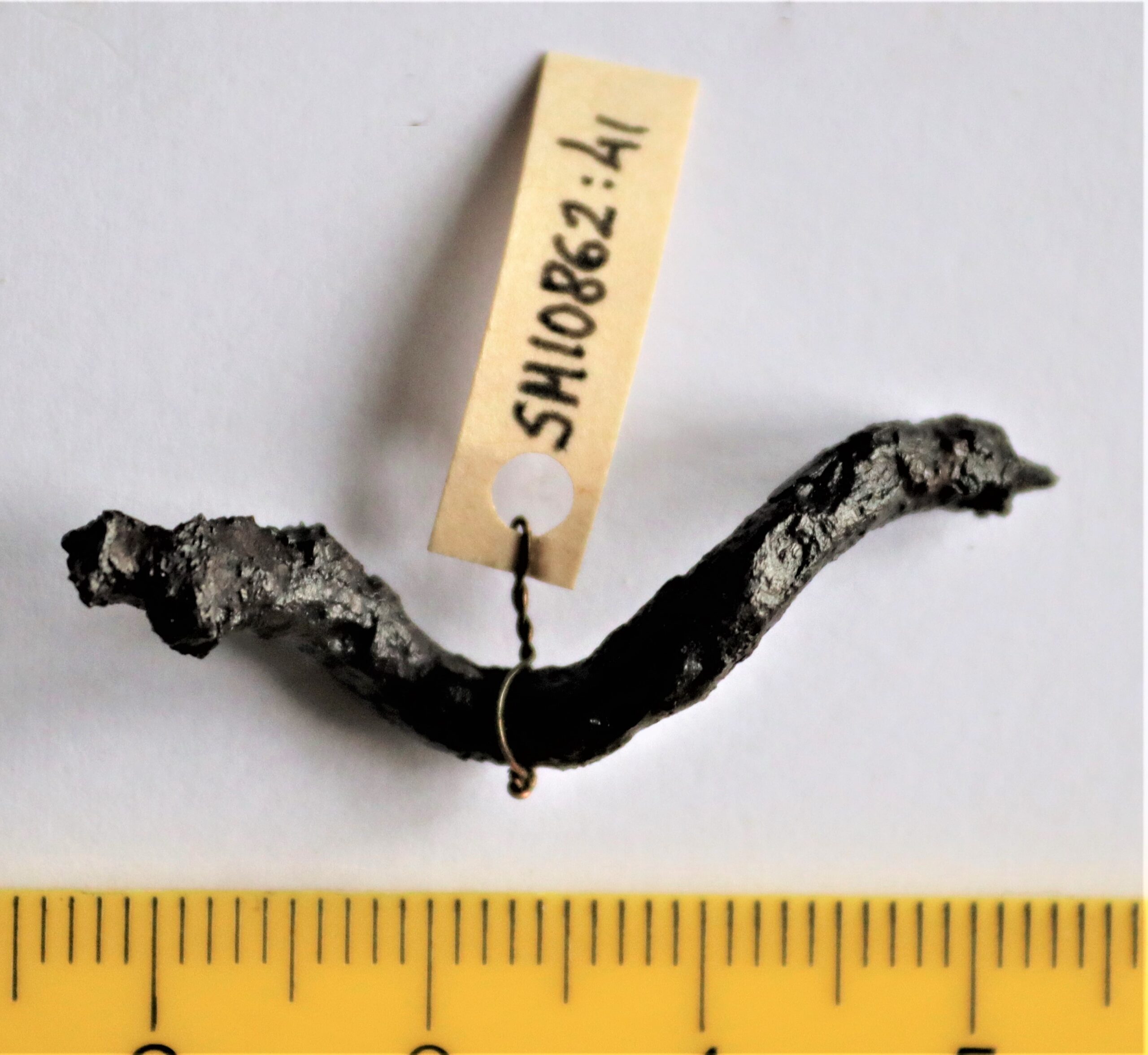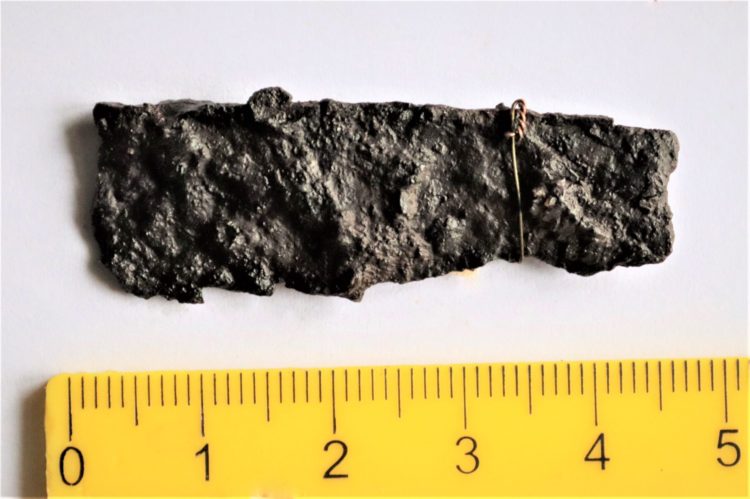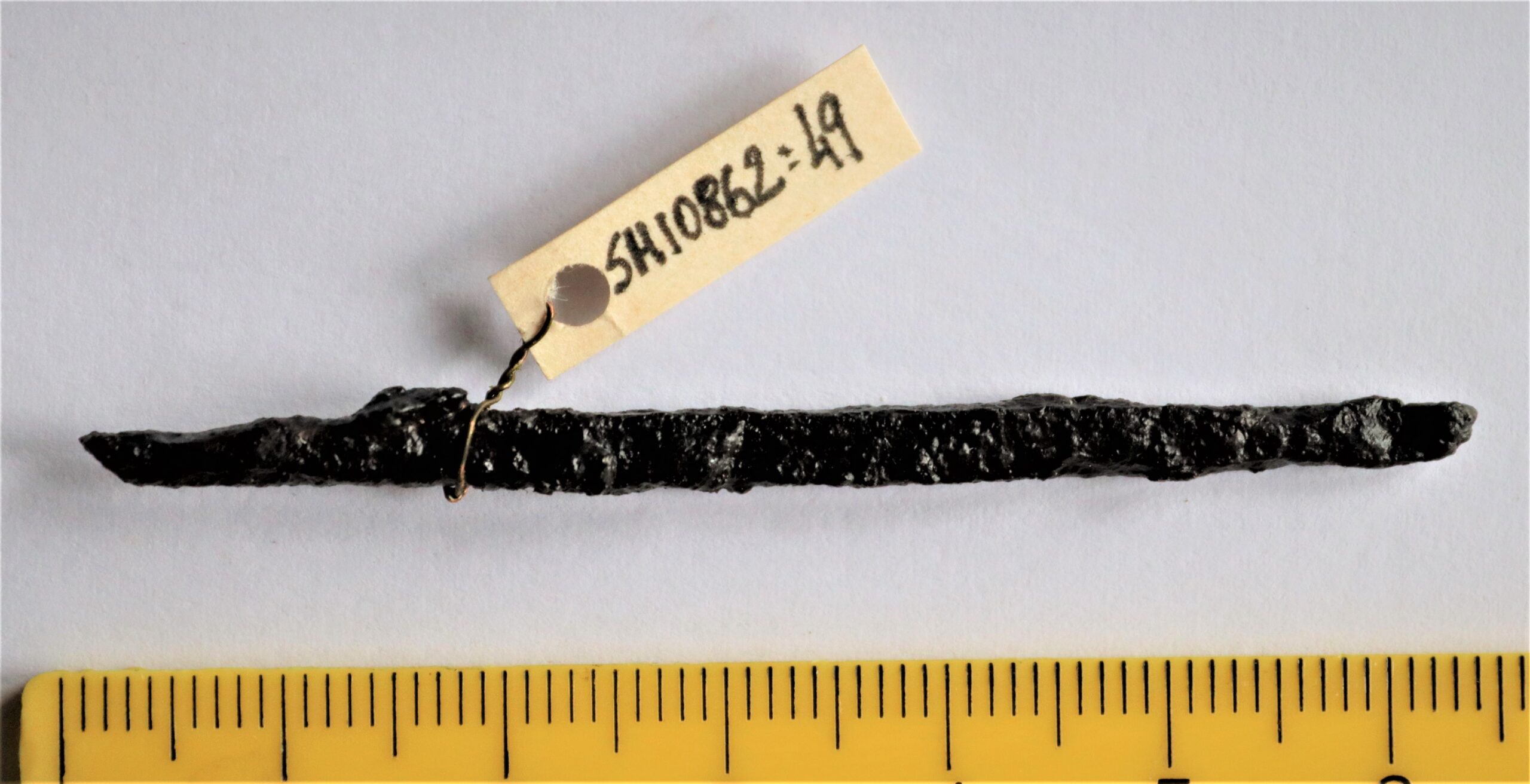 Esemekatke, raud. Ümmarguse ristlõikega, peaosa lame, ilustatud kontsentriliste ringidega.