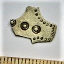 Hõbeplateeringu tükk. Peal ornament, mis koosneb kolmest kahekordsest ringist, ääres väikeste ringikeste vöönd.