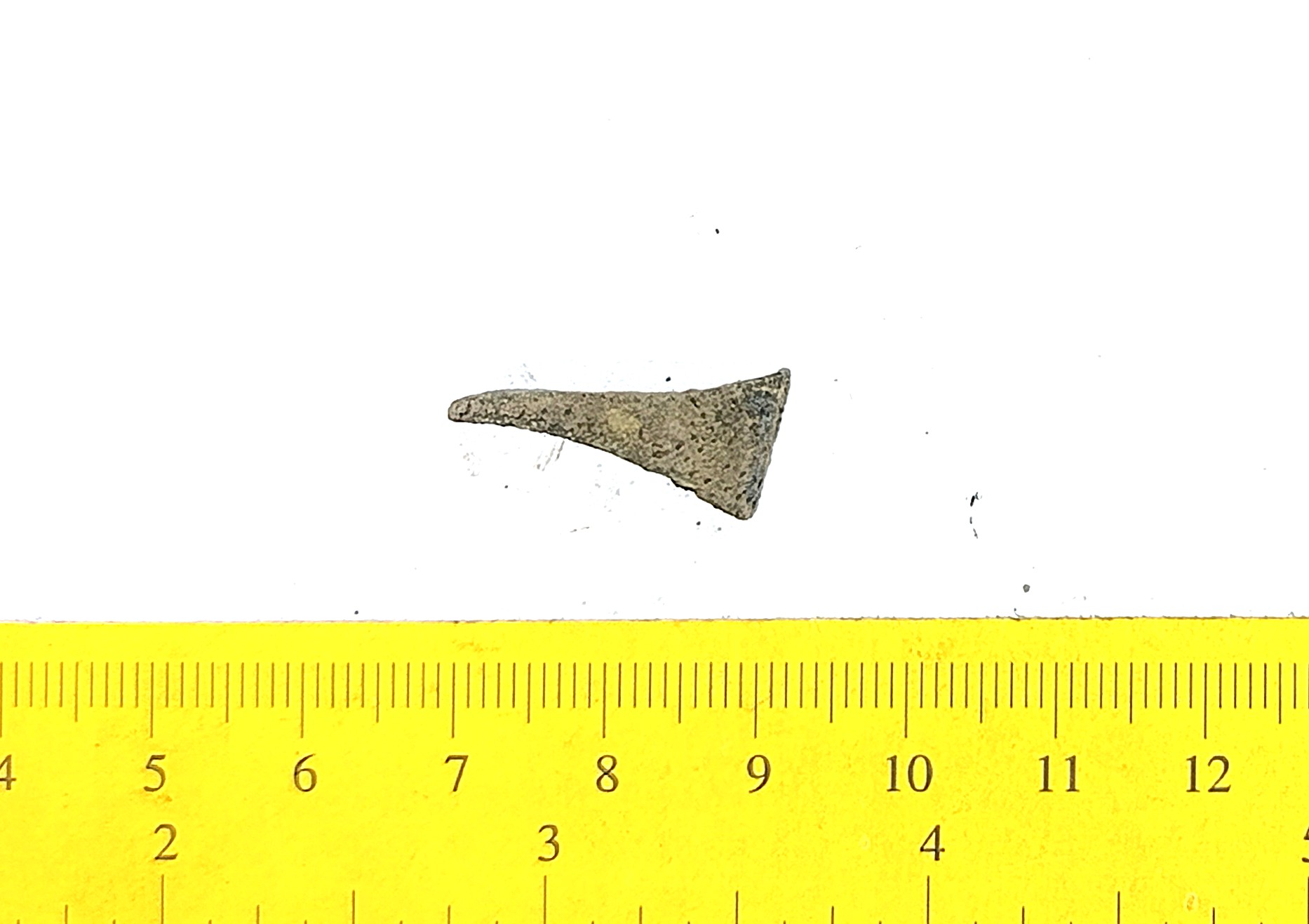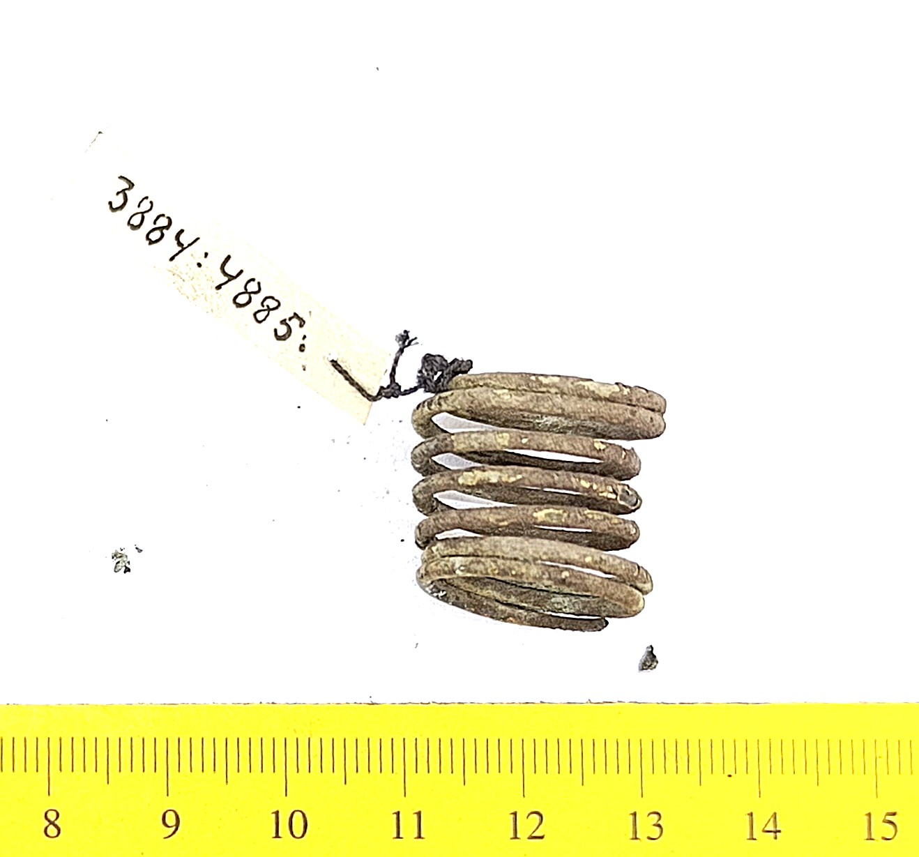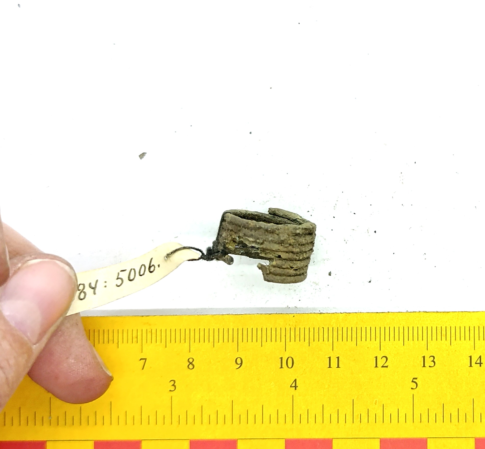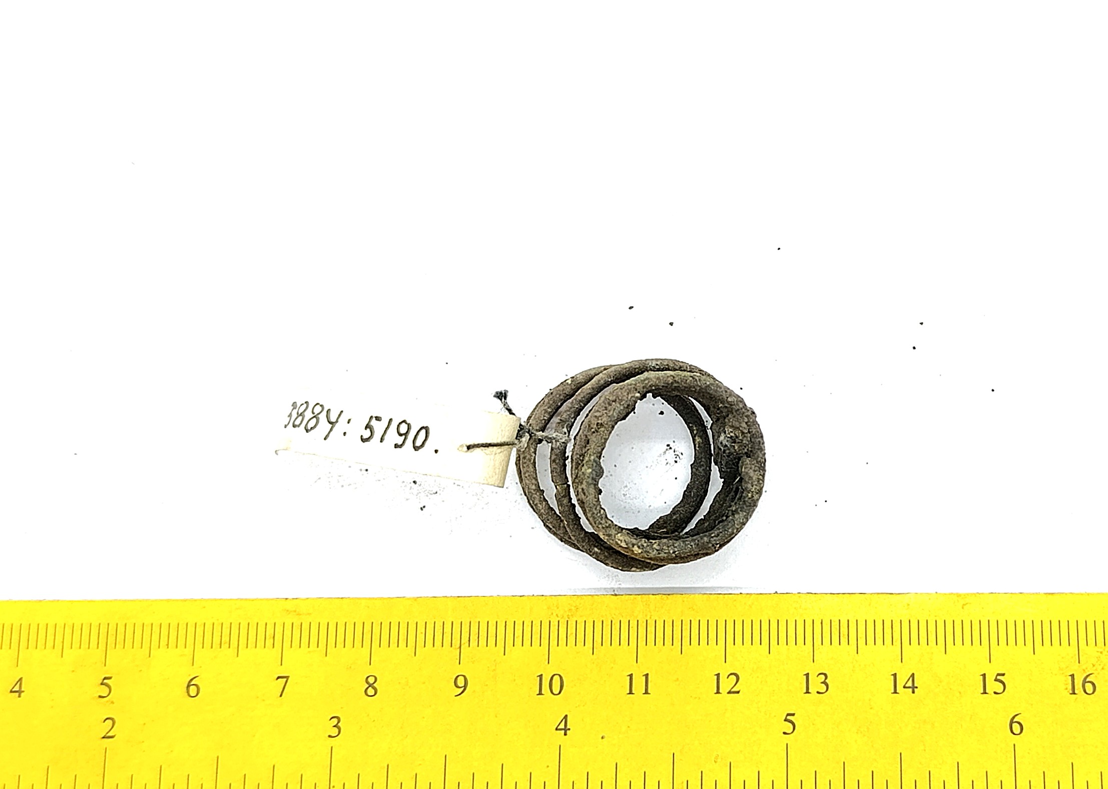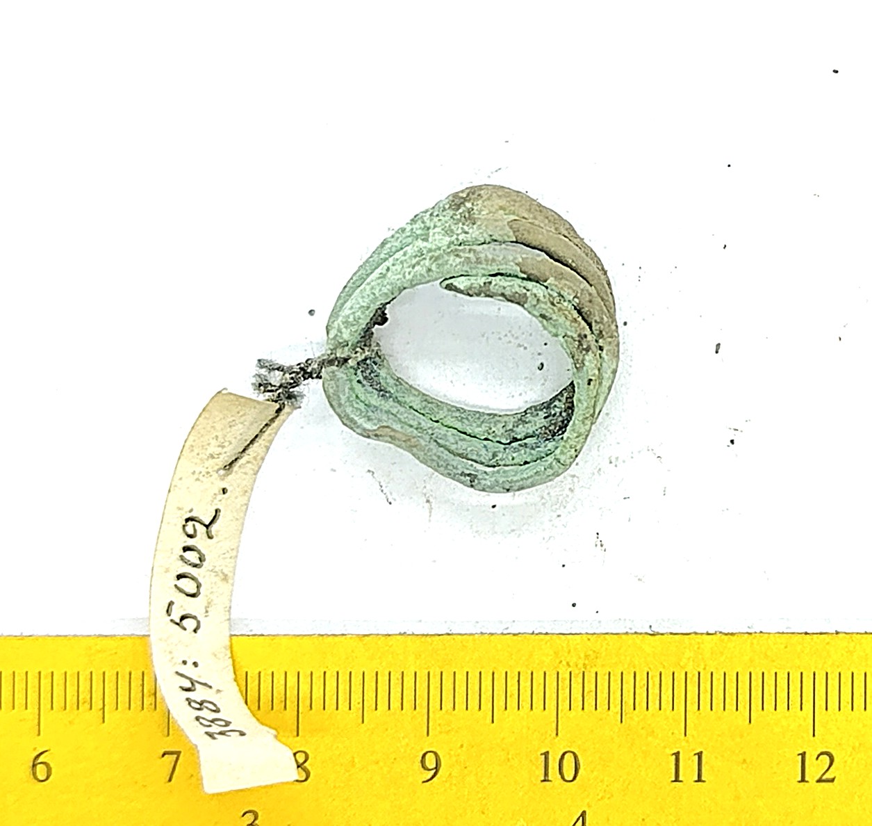 Finger-ring with a widening central part, copper alloy. Similar rings have been found in the Eura Luistari and Saramäki burials in Finland where they are dated to the 11th century (Lehtsalo-Hilander 1982, 124–126) and from Abelnieki burials in Latvia, where they are dated from the second half of the 11th century to the beginning of the 13th century (Vasks 2008, 157–158). These rings also occur in Gotland, where they are dated to the 11th-12th century in Gotland (Thunmark-Nylen 1998, Pl. 143). In Saaremaa, a similar finger-ring is recorded in Valjala churchyard where it, according to the context, belongs to the 13th or perhaps late 12th century.