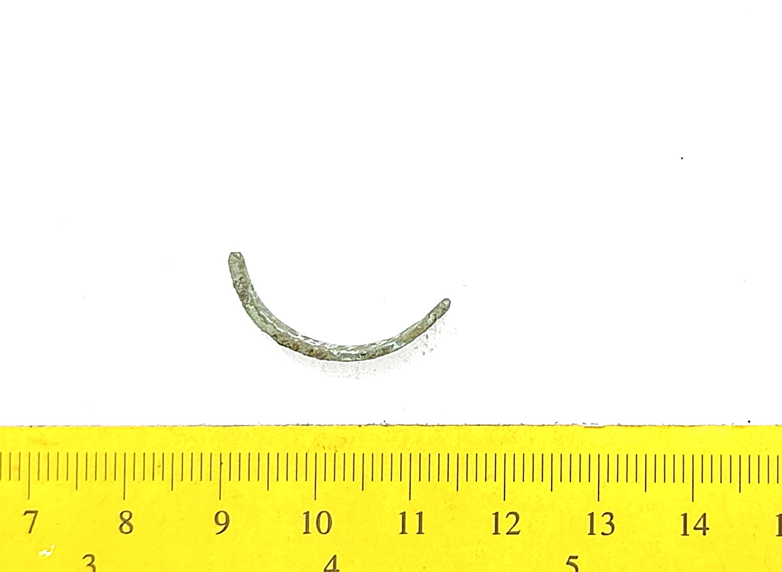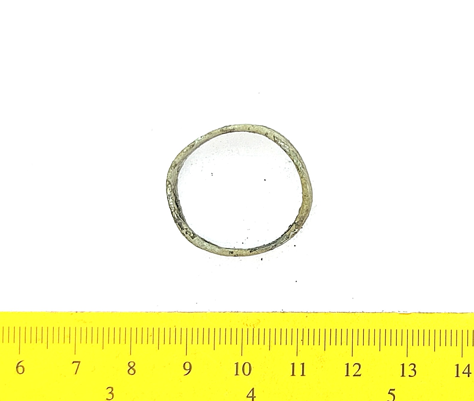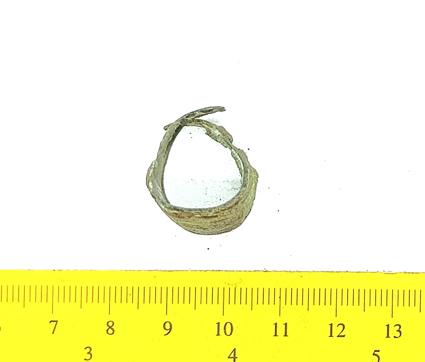 Finger-ring with a widening central part, copper alloy. Similar rings have been found in the Eura Luistari and Saramäki burials in Finland where they are dated to the 11th century (Lehtsalo-Hilander 1982, 124–126) and from Abelnieki burials in Latvia, where they are dated from the second half of the 11th century to the beginning of the 13th century (Vasks 2008, 157–158). These rings also occur in Gotland, where they are dated to the 11th-12th century in Gotland (Thunmark-Nylen 1998, Pl. 143). In Saaremaa, a similar finger-ring is recorded in Valjala churchyard where it, according to the context, belongs to the 13th or perhaps late 12th century.
