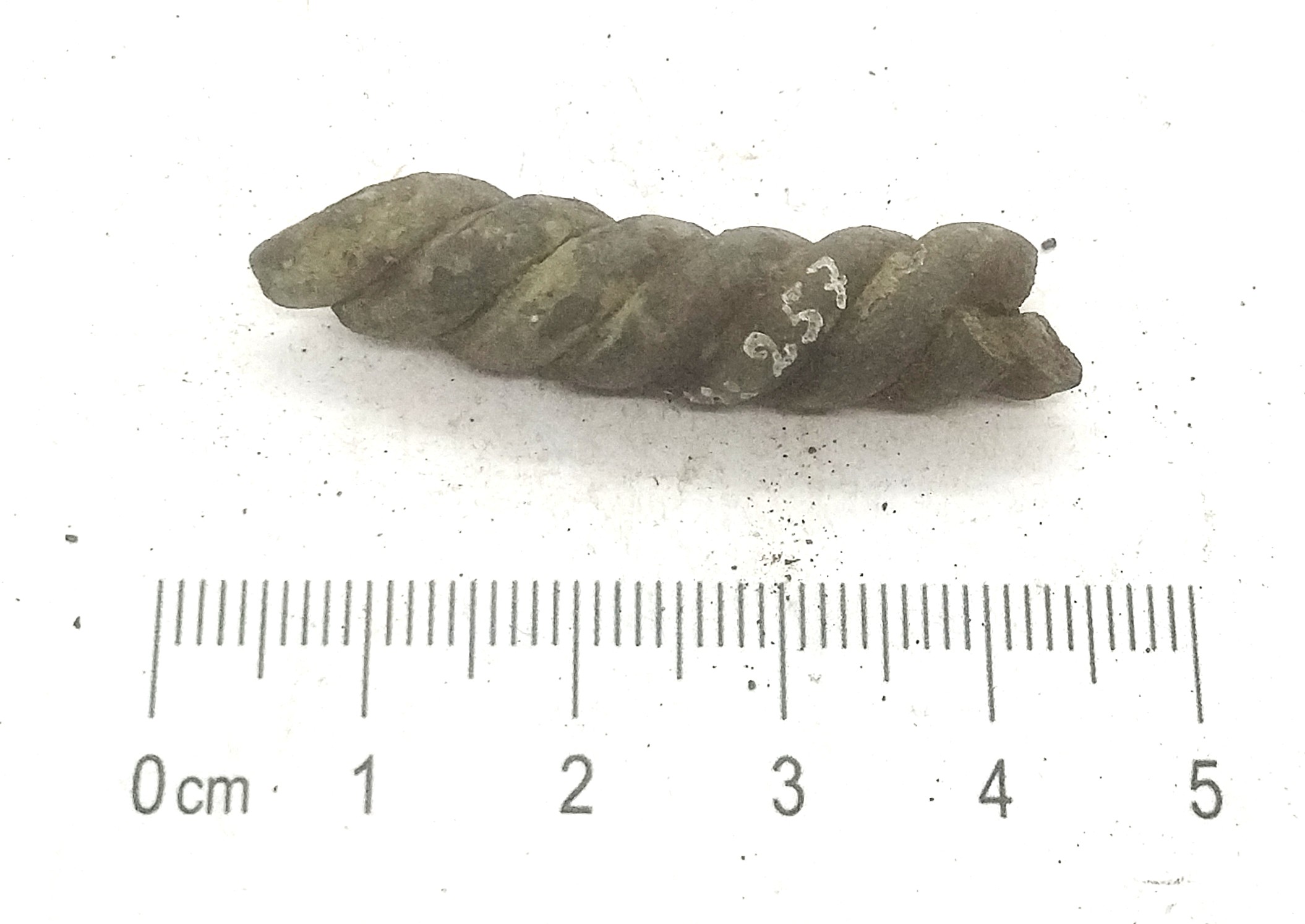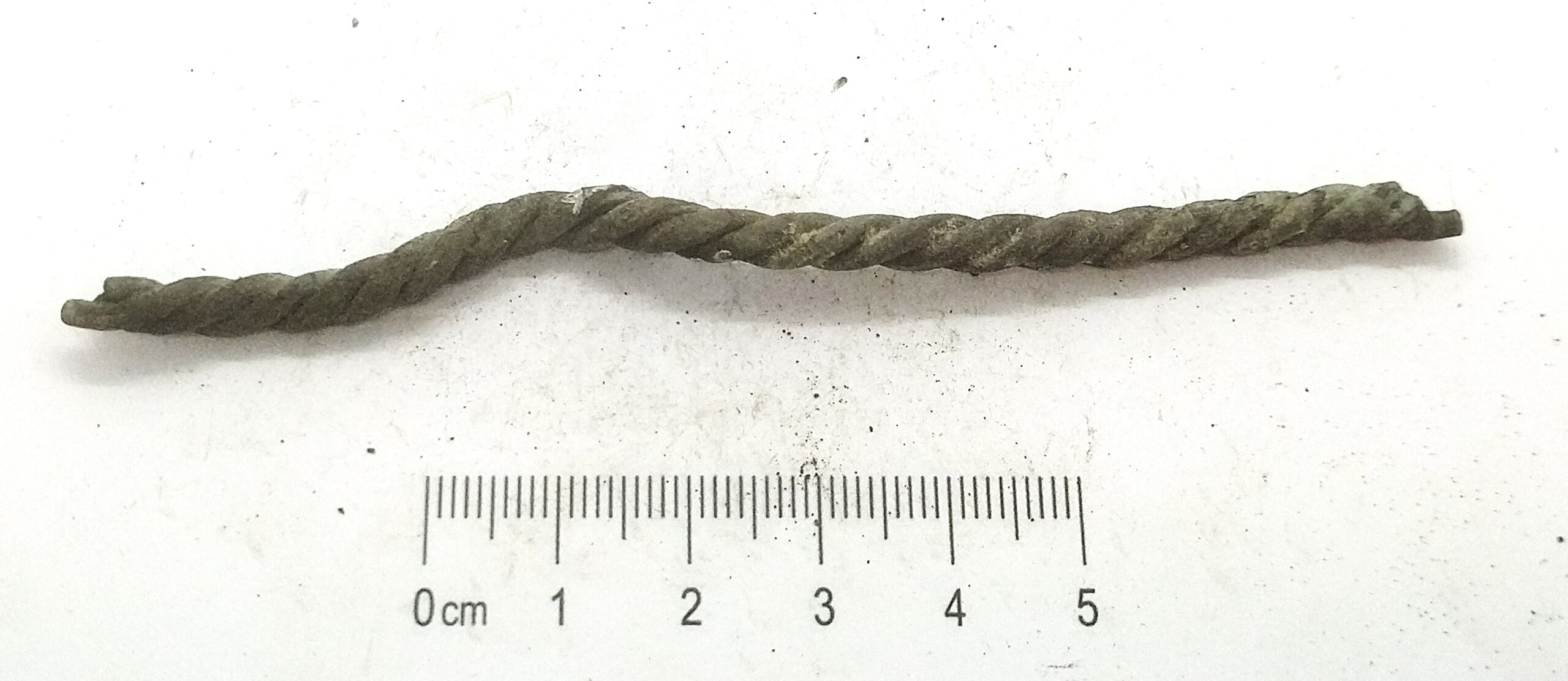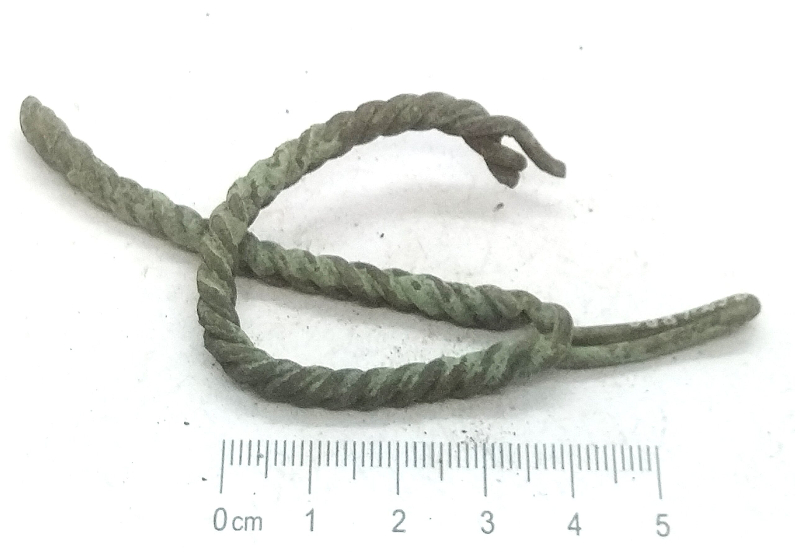 Fragment of a neck ring, copper alloy. Fragments of neck rings made of several twisted wires are common finds in Saaremaa stone graves with cremations. Since it is normally not possible to determine the exact type of these neck-rings, they can be dated to the whole period from the 10th to the 13th century (see also: Mägi 2002, 107).