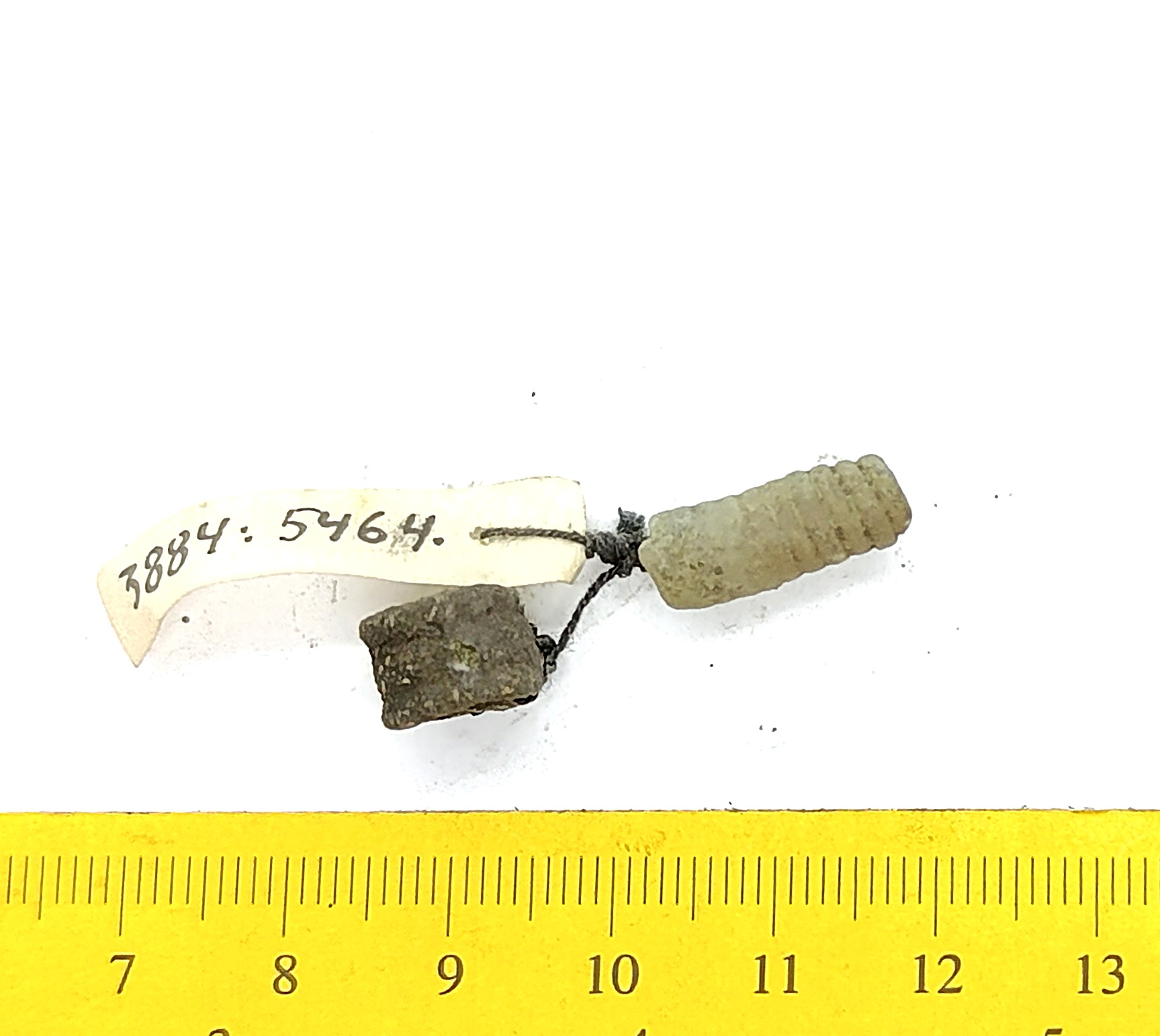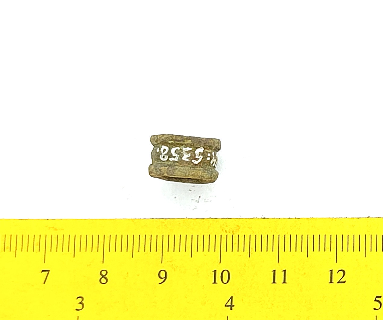 Bead, copper alloy. Bronze beads of this type have been found in stone graves with cremations (e.g. Mägi 2002, Pl. 13: 19–21) as well as inhumation burials dating to the 12th – 13th centuries (see Spirģis 2008, 421). In Estonia they are usually associated with belt ornaments.