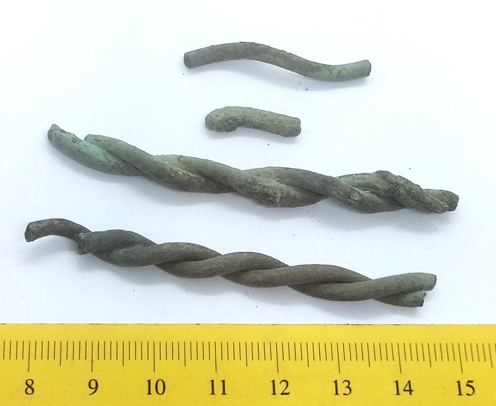 Fragments of a neck ring, 4, copper alloy. Fragments of neck rings made of several twisted wires are common finds in Saaremaa stone graves with cremations. Since it is normally not possible to determine the exact type of these neck-rings, they can be dated to the whole period from the 10th to the 13th century (see also: Mägi 2002, 107).