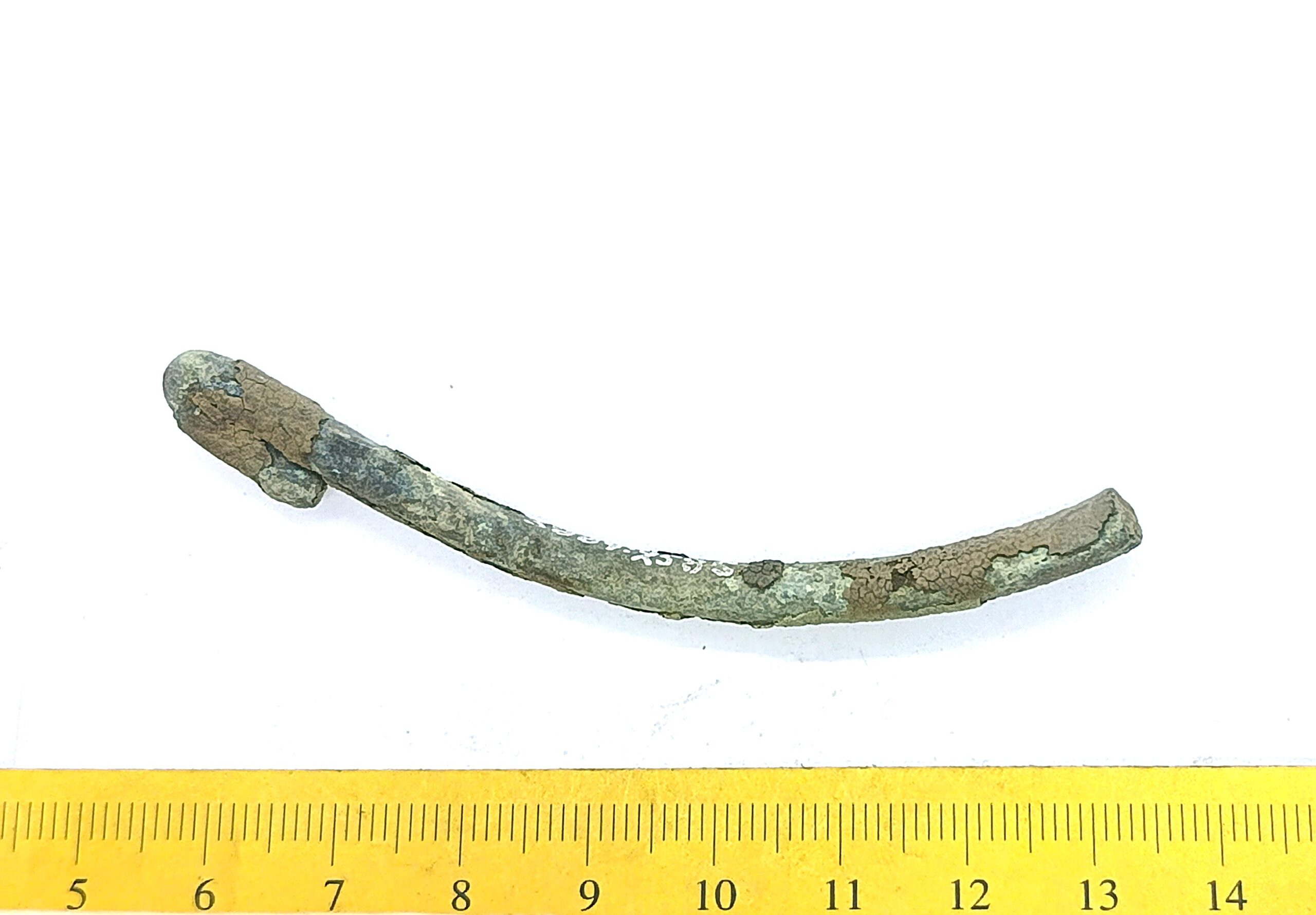 Fragment of a neck ring, copper alloy. Composite neck rings are usually assembled from three separate rings, using copper alloy clasps. This type of neck ring has only been found on Saaremaa (Mägi 2002, 107; 2019, 73). Similar finds have been obtained from Kurzeme, and they were also worn by Semigallians in the 10th–11th centuries (Tvauri 2014, 144; Griciuvienė 2005, 76-77).