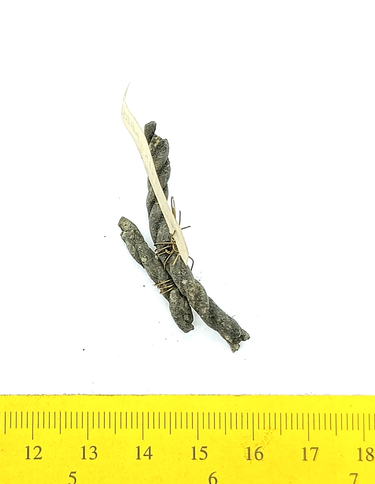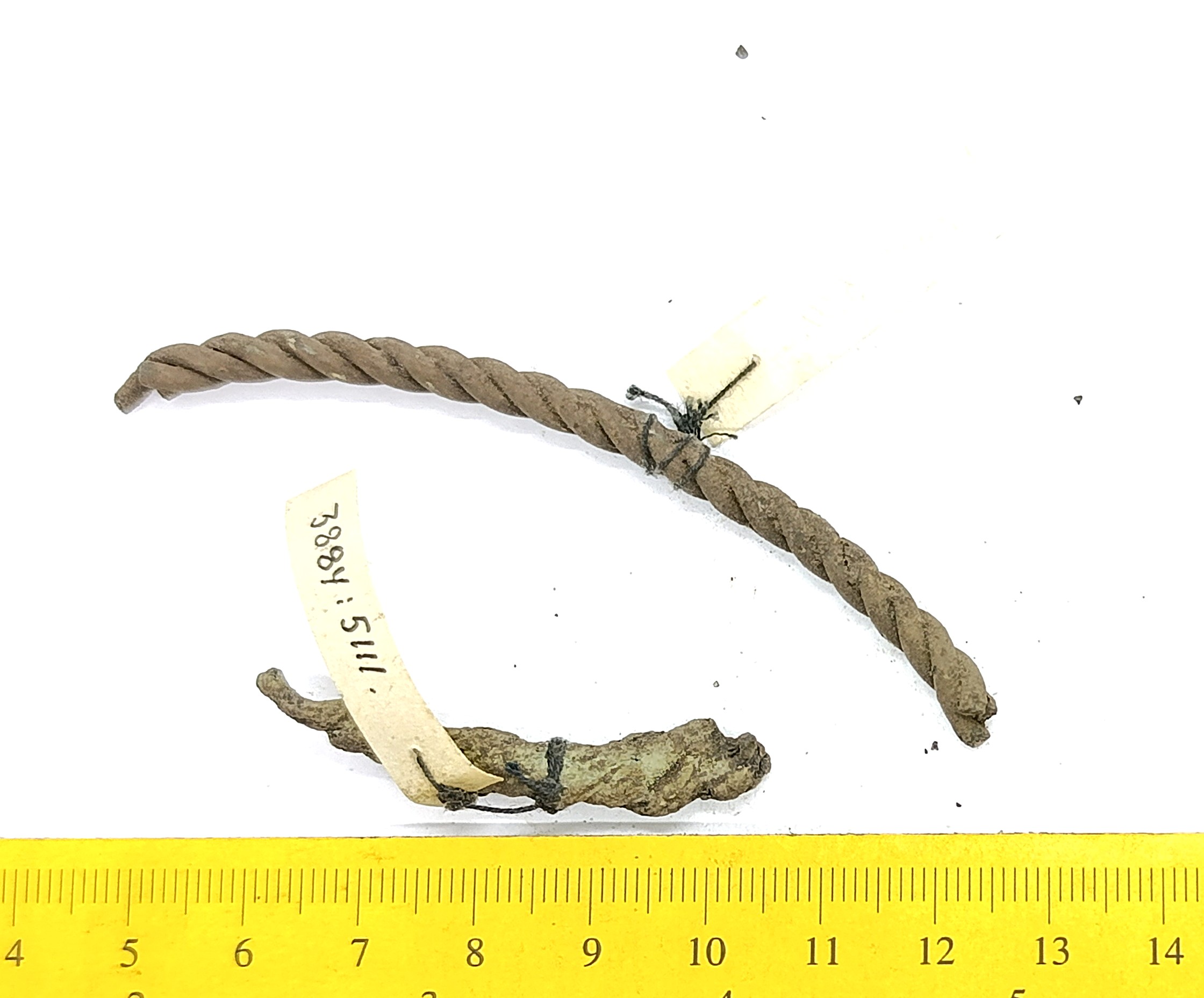 Fragments of a neck ring, 2, copper alloy. Fragments of neck rings made of several twisted wires are common finds in Saaremaa stone graves with cremations. Since it is normally not possible to determine the exact type of these neck-rings, they can be dated to the whole period from the 10th to the 13th century (see also: Mägi 2002, 107).