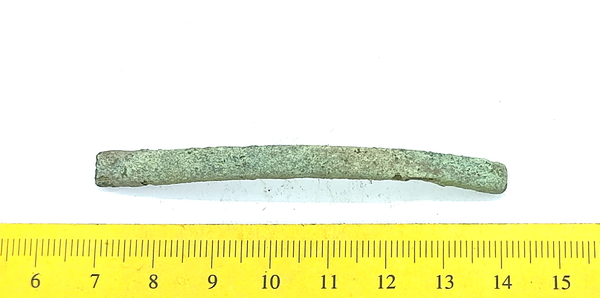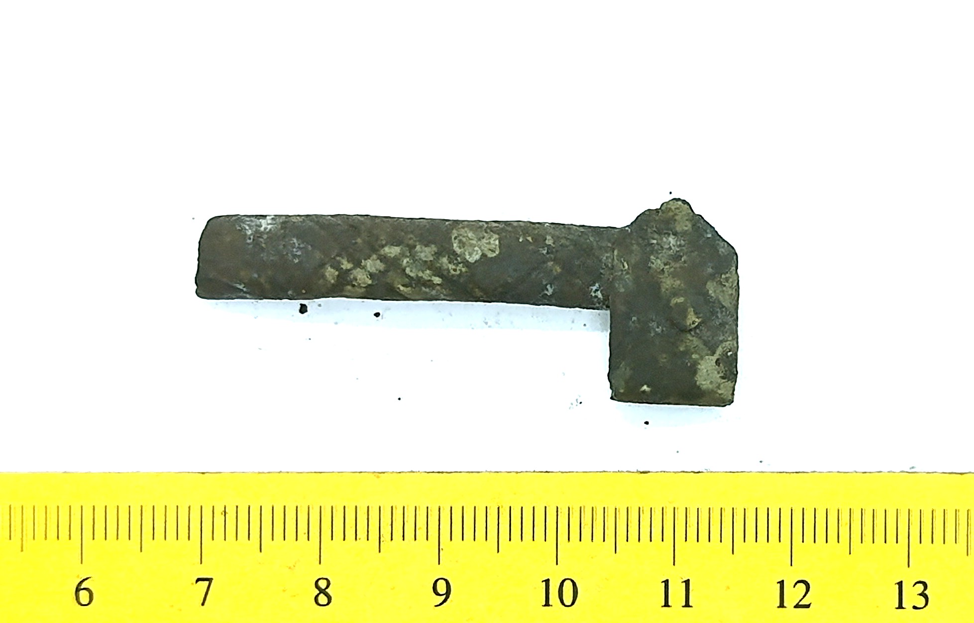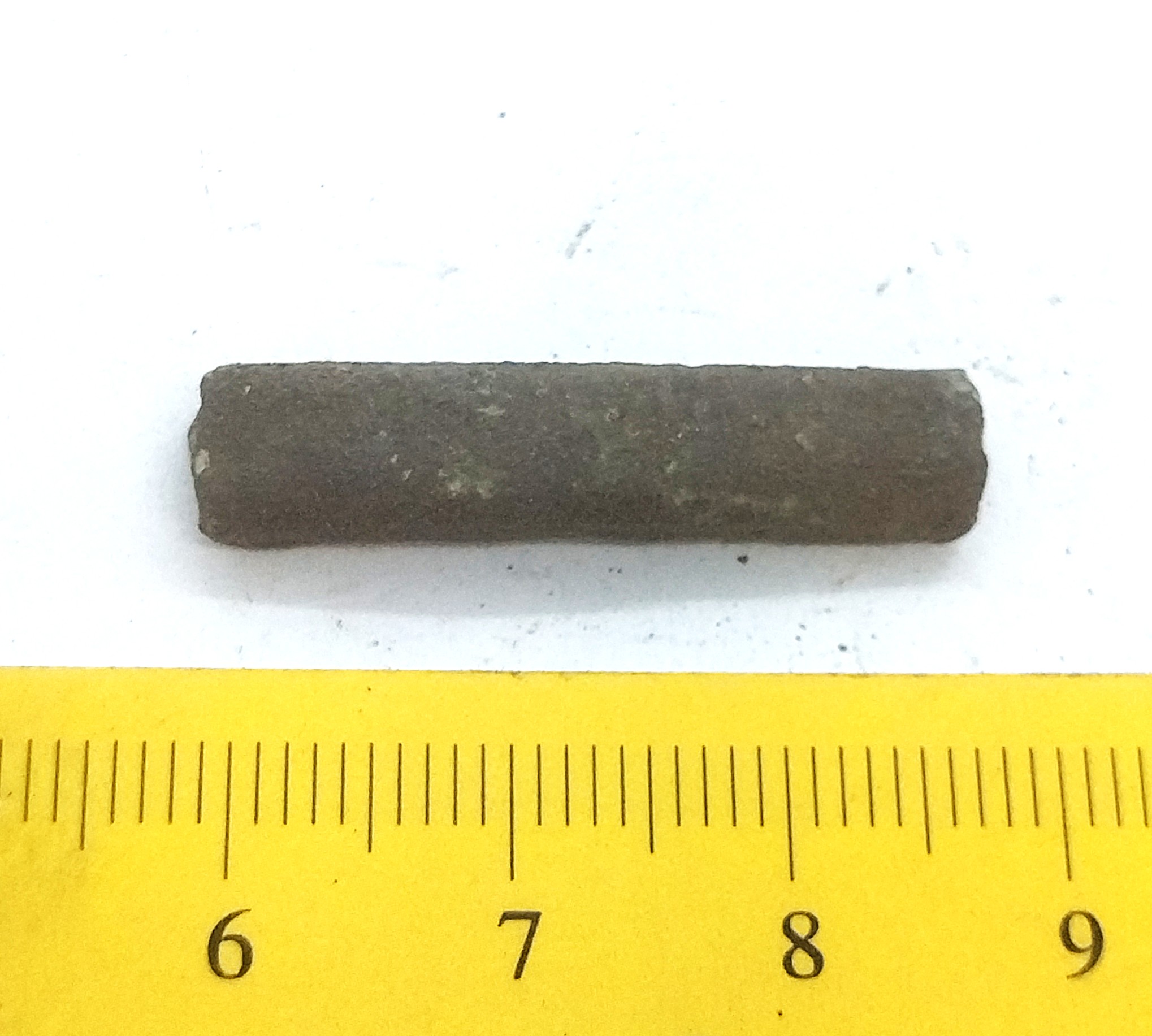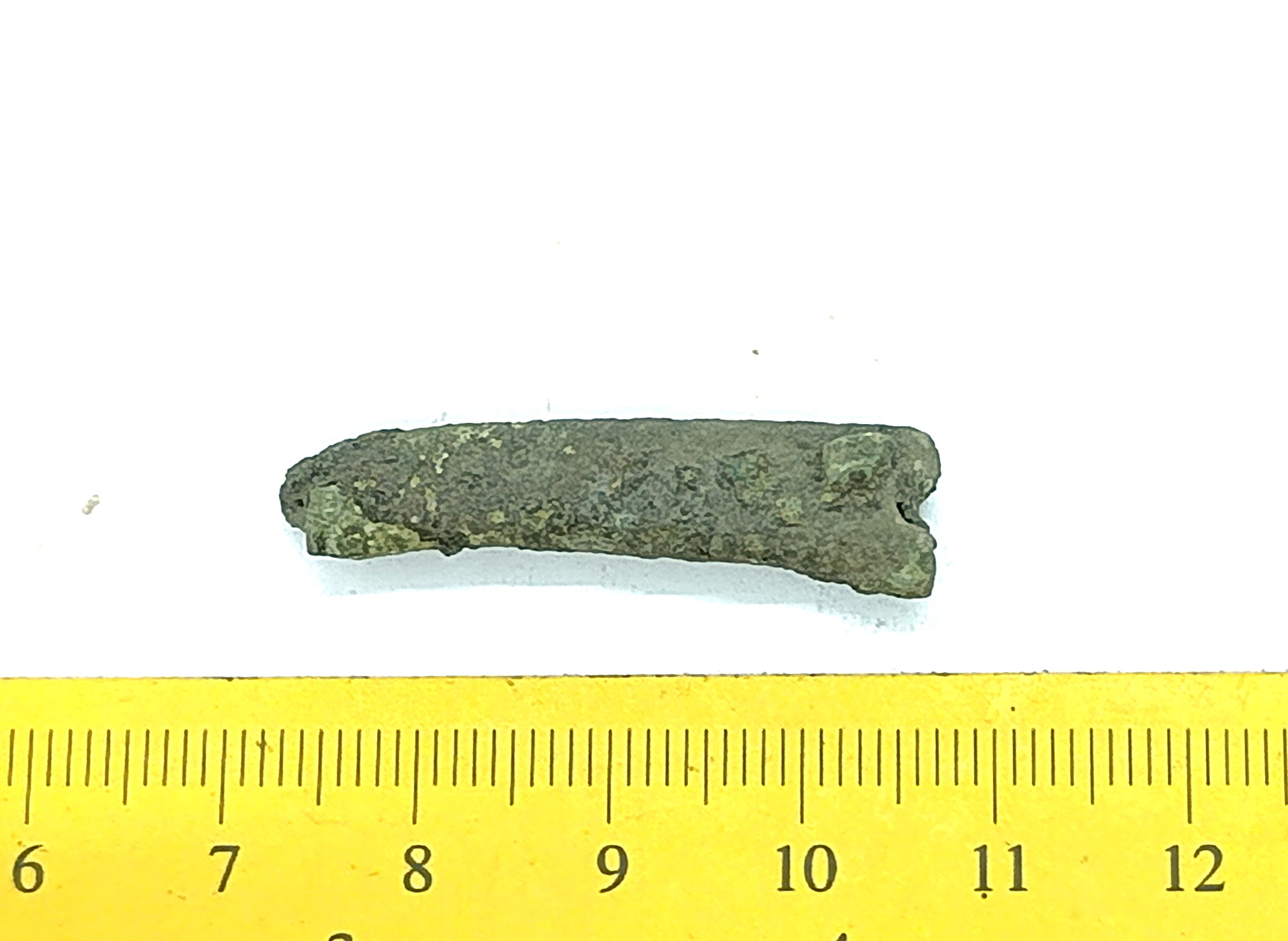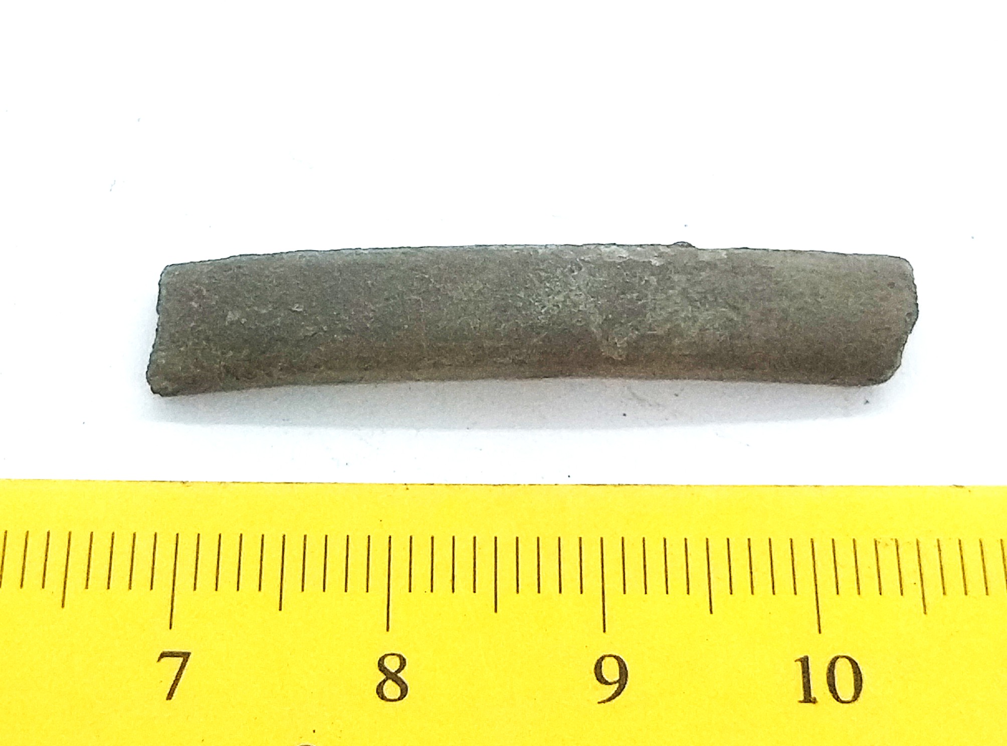 Fragment of a neck ring, copper alloy. Composite neck rings are usually assembled from three separate rings, using copper alloy clasps. This type of neck ring has only been found on Saaremaa (Mägi 2002, 107; 2019, 73). Similar finds have been obtained from Kurzeme, and they were also worn by Semigallians in the 10th–11th centuries (Tvauri 2014, 144; Griciuvienė 2005, 76-77).