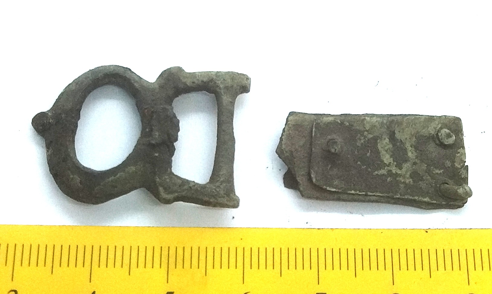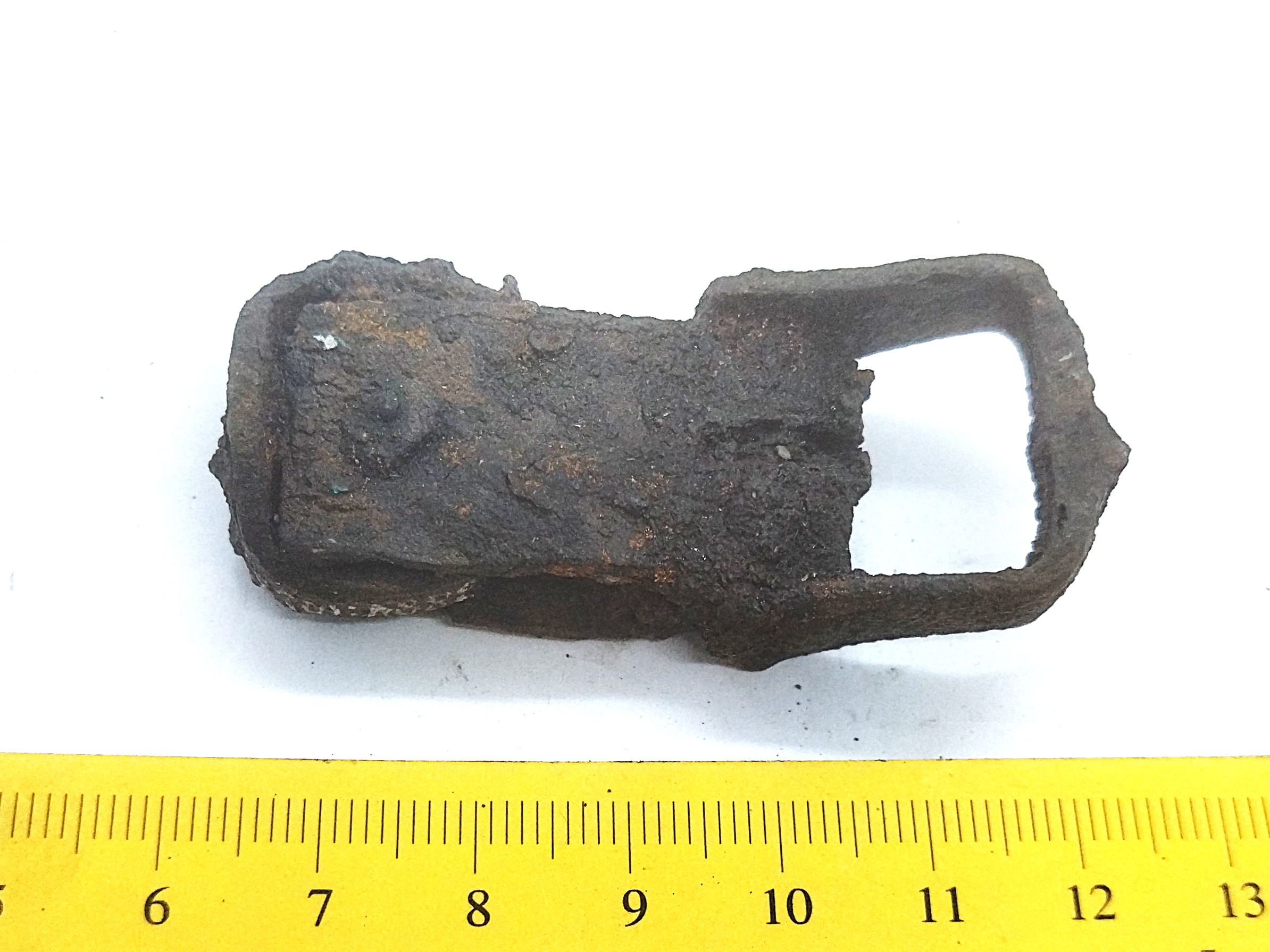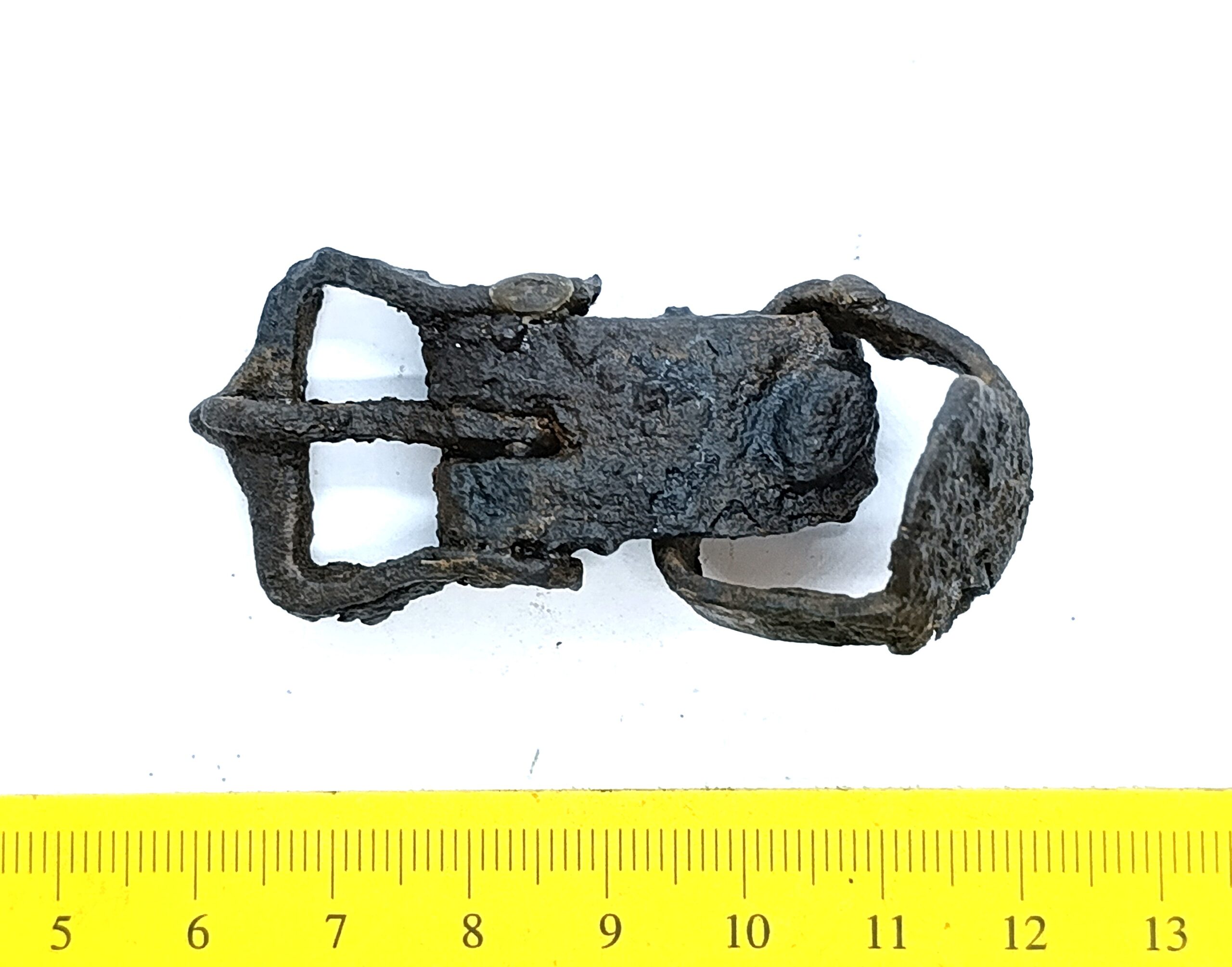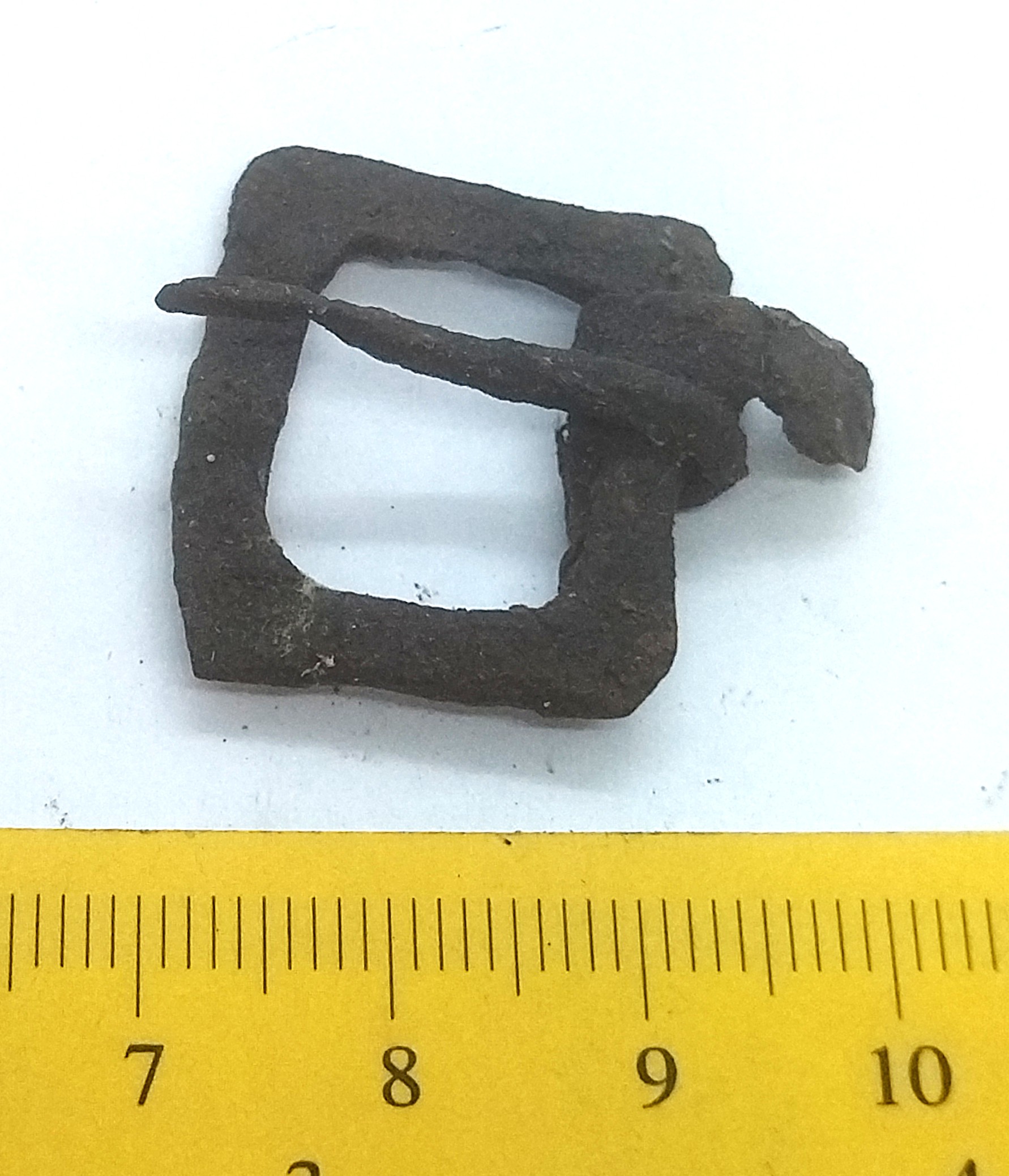 Gotland-Baltic type buckle, copper alloy. Previously the buckle type was believed to have developed in Gotland. Later data, however, shows that the buckle form could originate from the Baltics after which it was adapted in Gotland (Lehtsalo-Hilander 1982, 149–151; Mägi 2002, 97; for Gotlandic material see Thunmark-Nylen 1992, Pl. 127–129). The earliest buckles of this type belong to the second half of the 10th century, but the latest variants can also be found in the 13th-century inhumation graves (e.g. Zariņa 2006, 233-237).