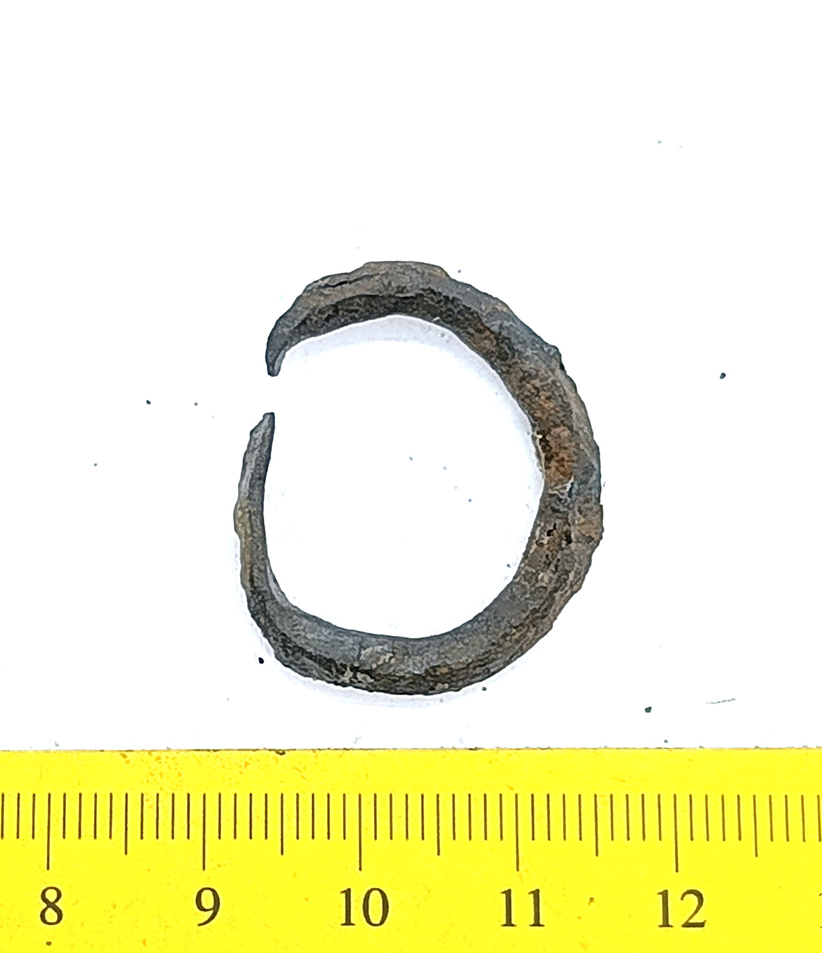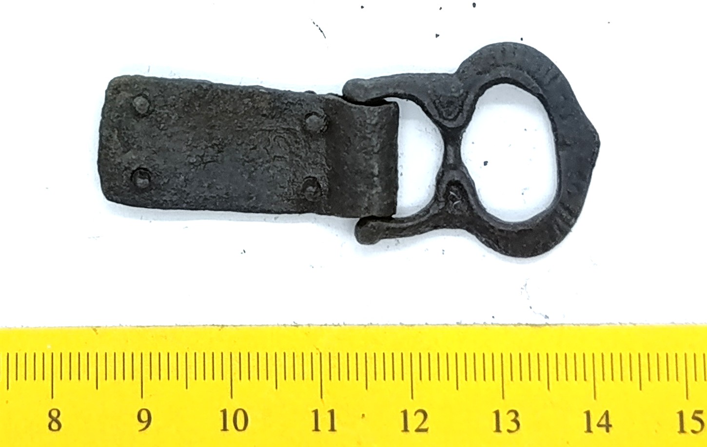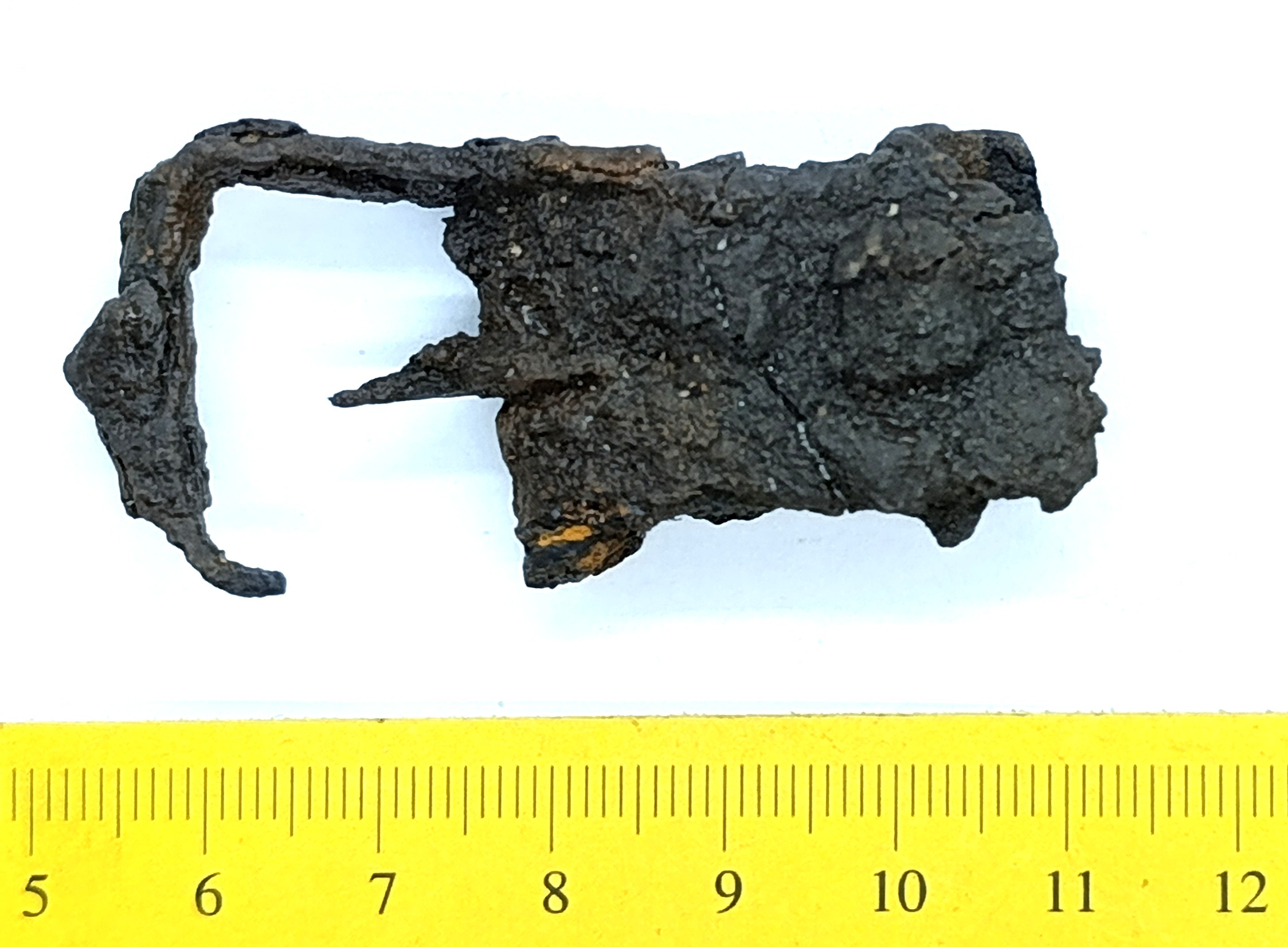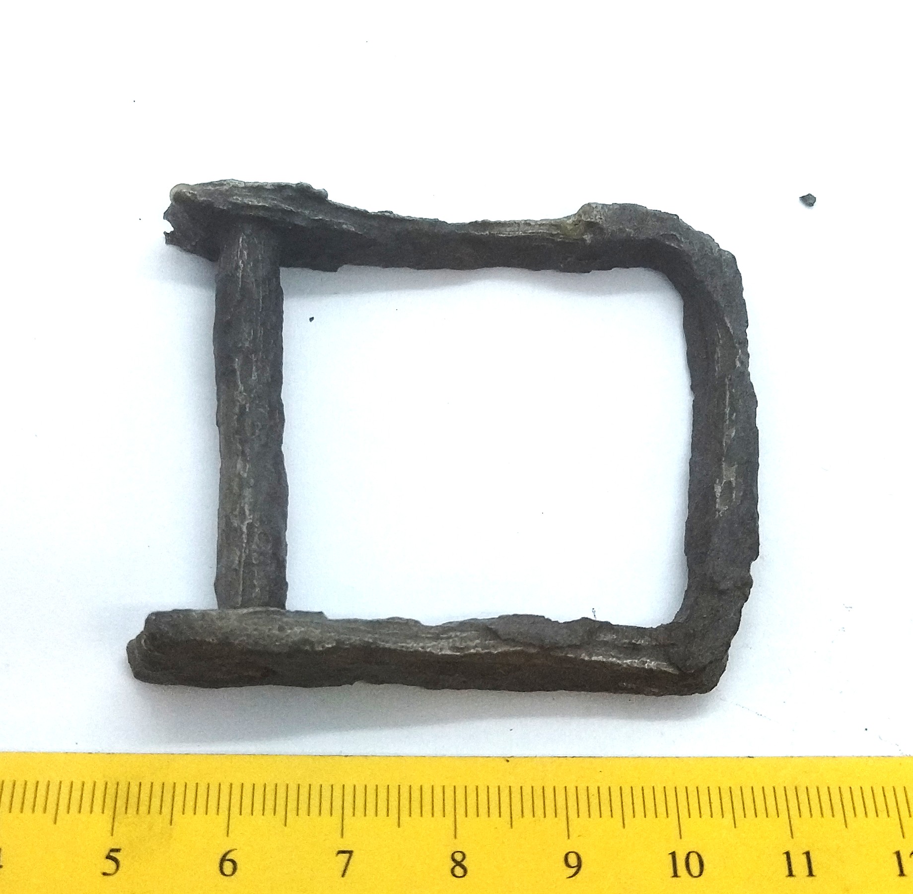 Buckle, iron. Perhaps part of bridles. This type of buckles usually includes a simple iron belt strap. They have been found mainly in stone graves and are not dated more precisely.