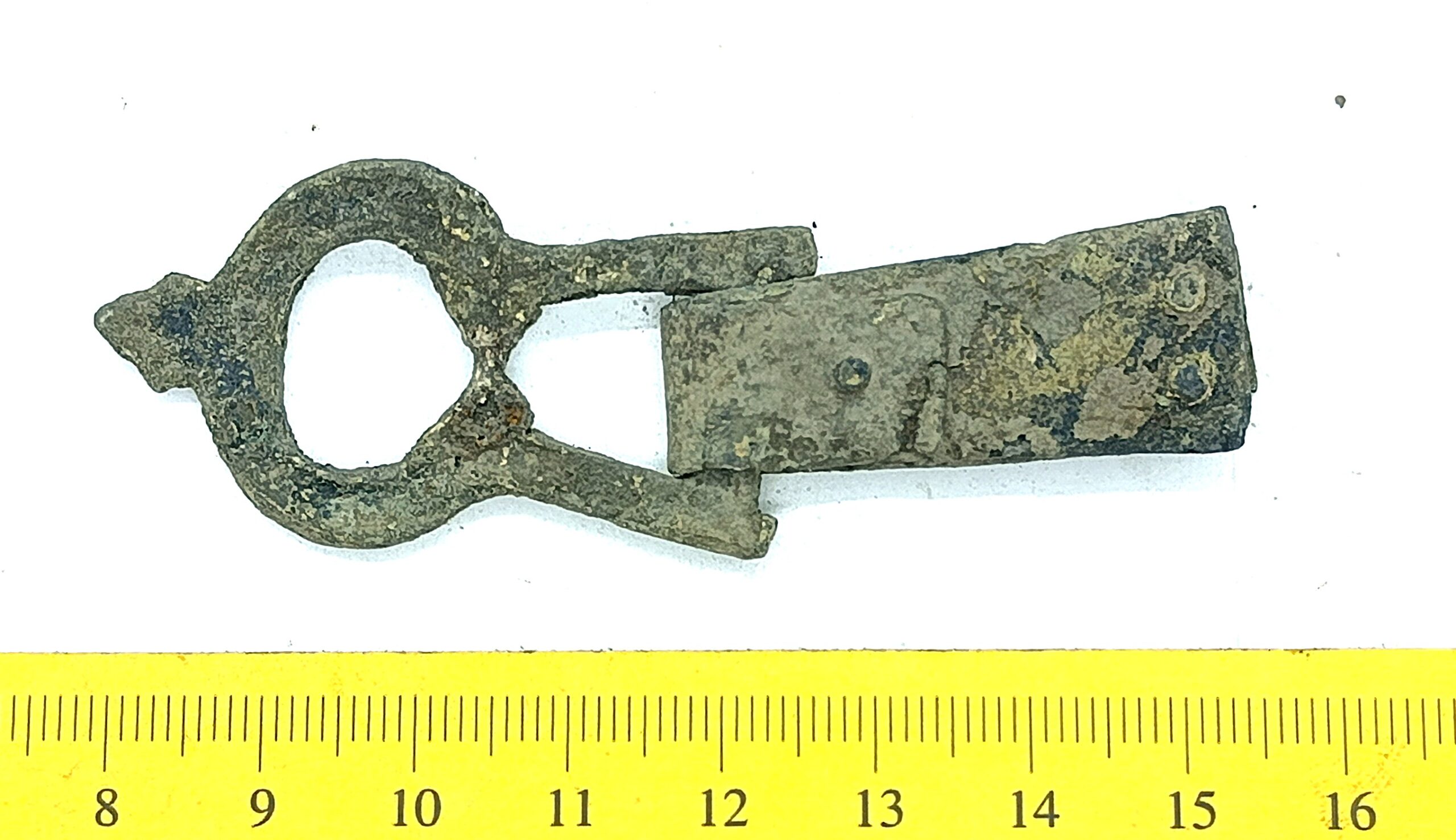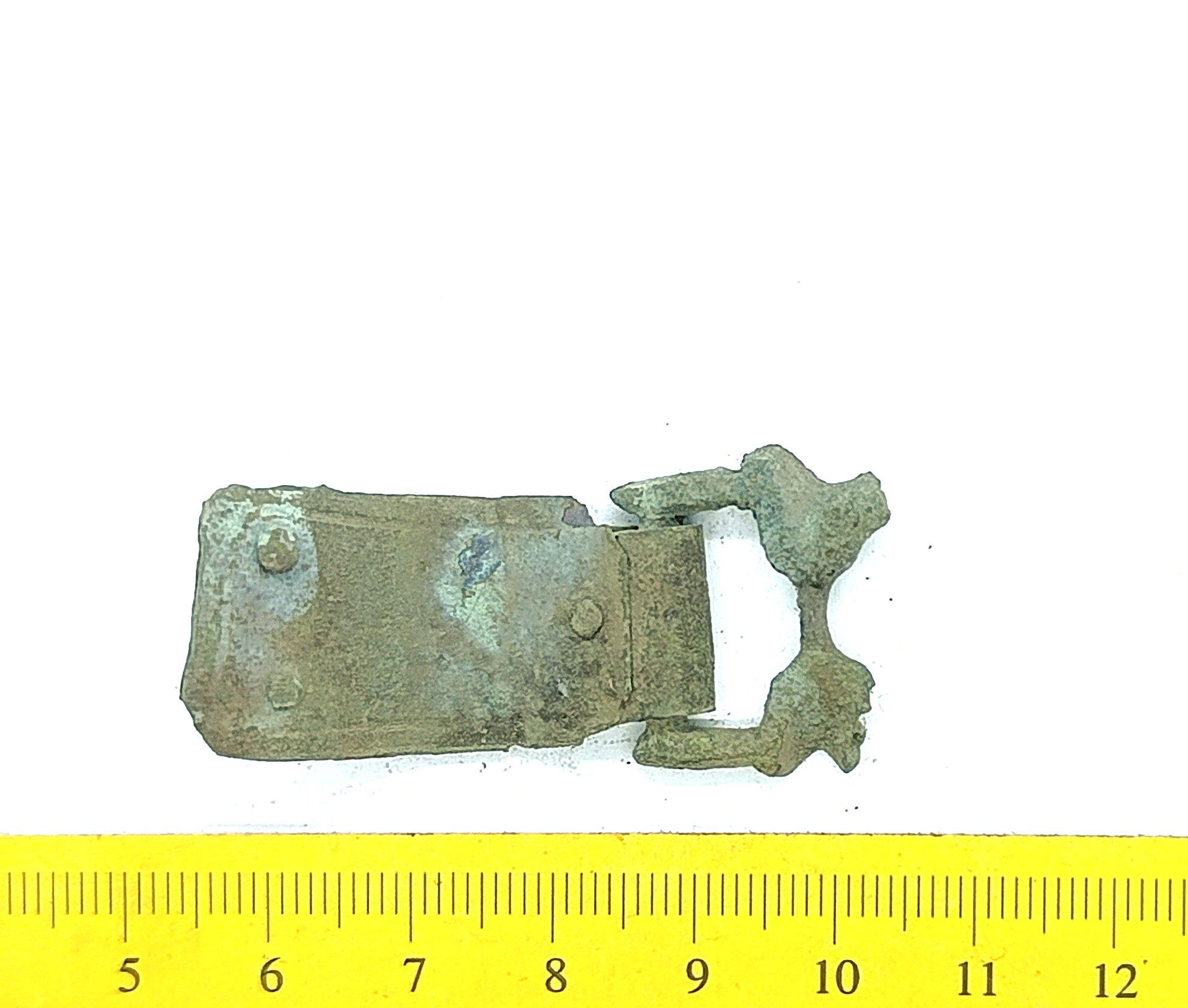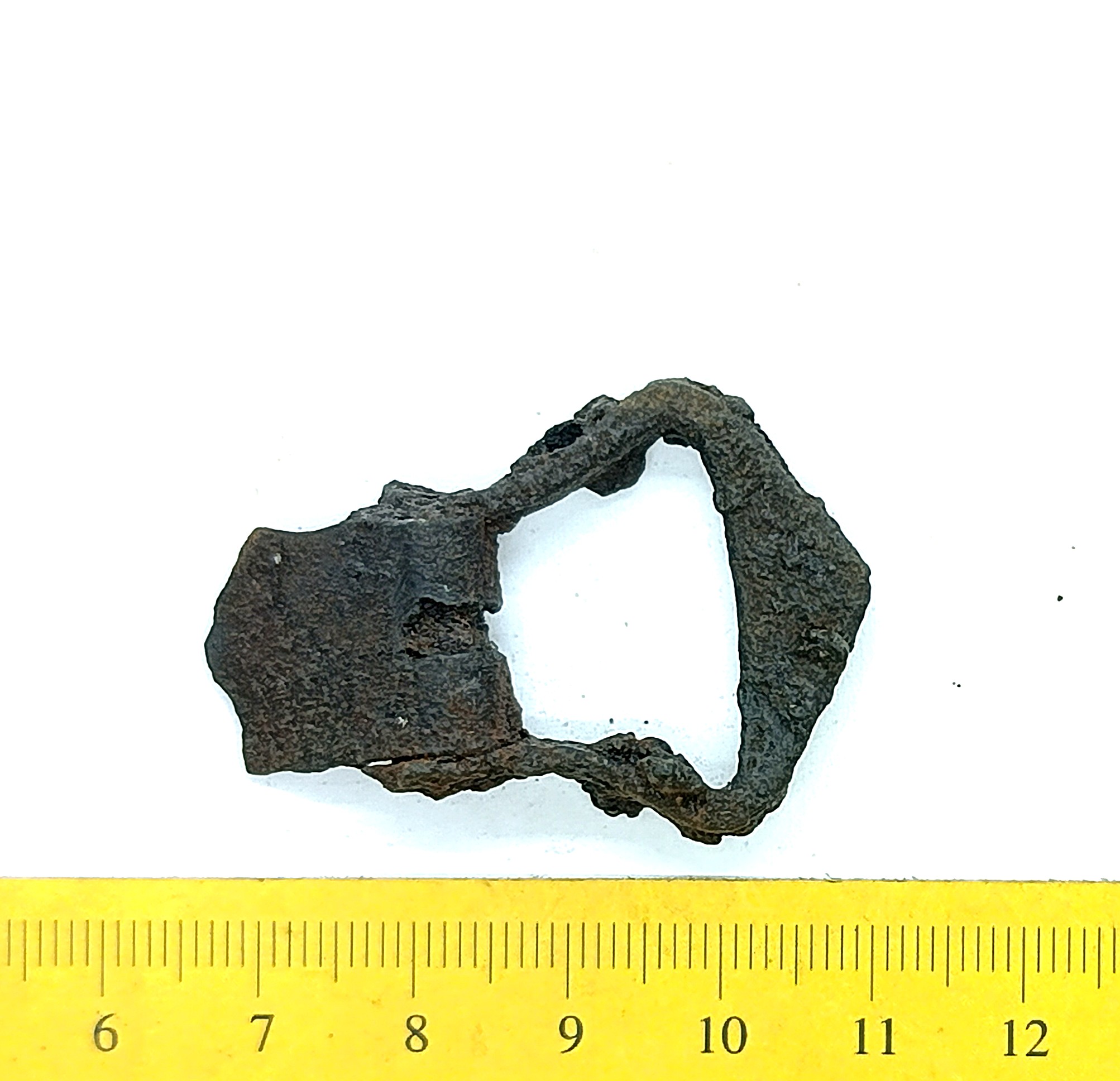 Gotland-Baltic type buckle, copper alloy. Previously the buckle type was believed to have developed in Gotland. Later data, however, shows that the buckle form could originate from the Baltics after which it was adapted in Gotland (Lehtsalo-Hilander 1982, 149–151; Mägi 2002, 97; for Gotlandic material see Thunmark-Nylen 1992, Pl. 127–129). The earliest buckles of this type belong to the second half of the 10th century, but the latest variants can also be found in the 13th-century inhumation graves (e.g. Zariņa 2006, 233-237). This specimen is probably the earlier variant.