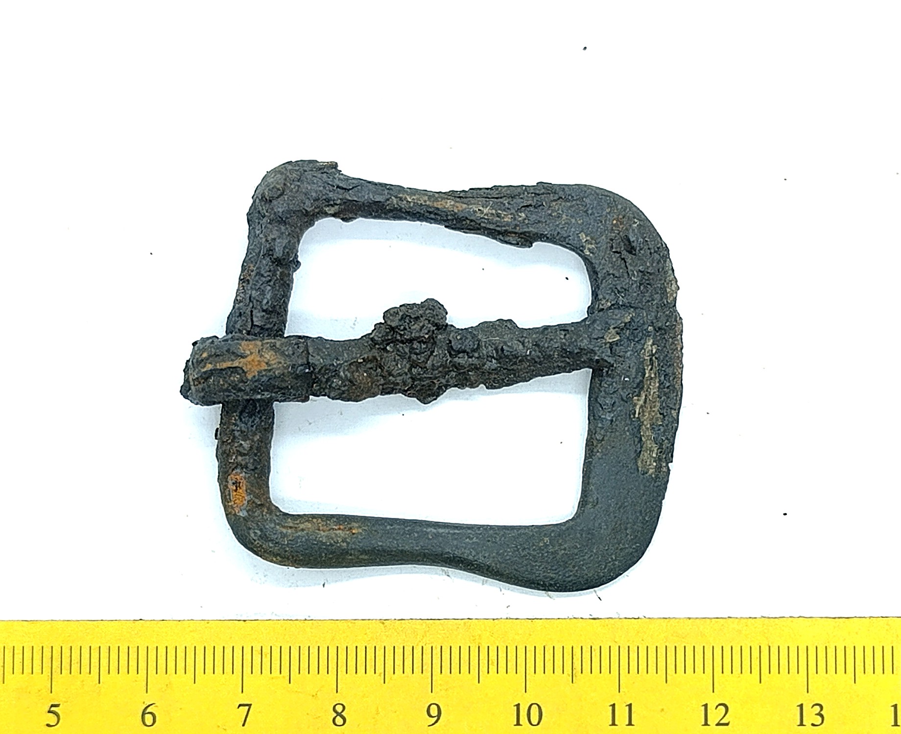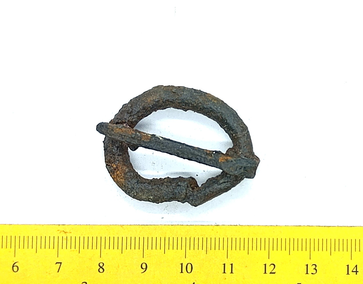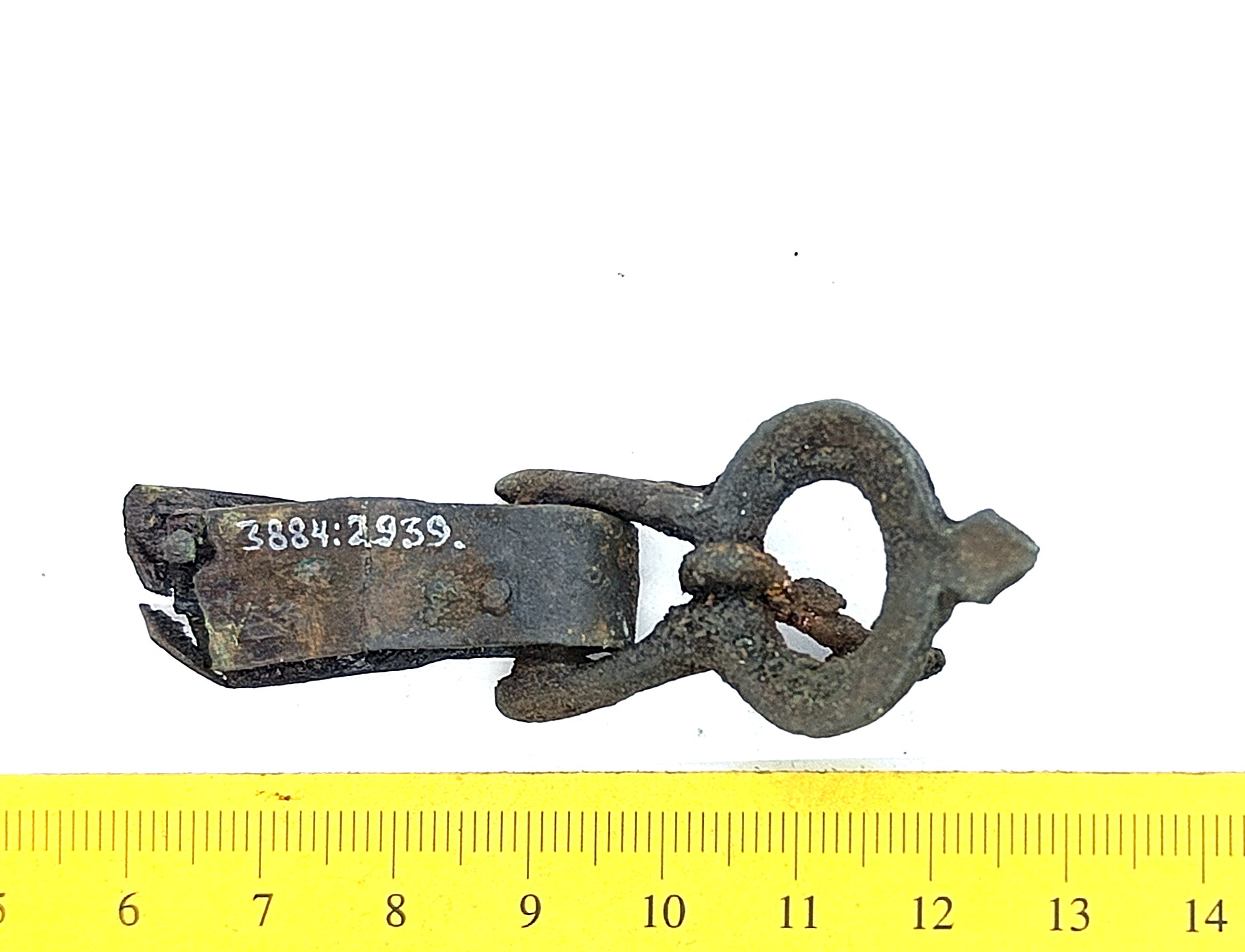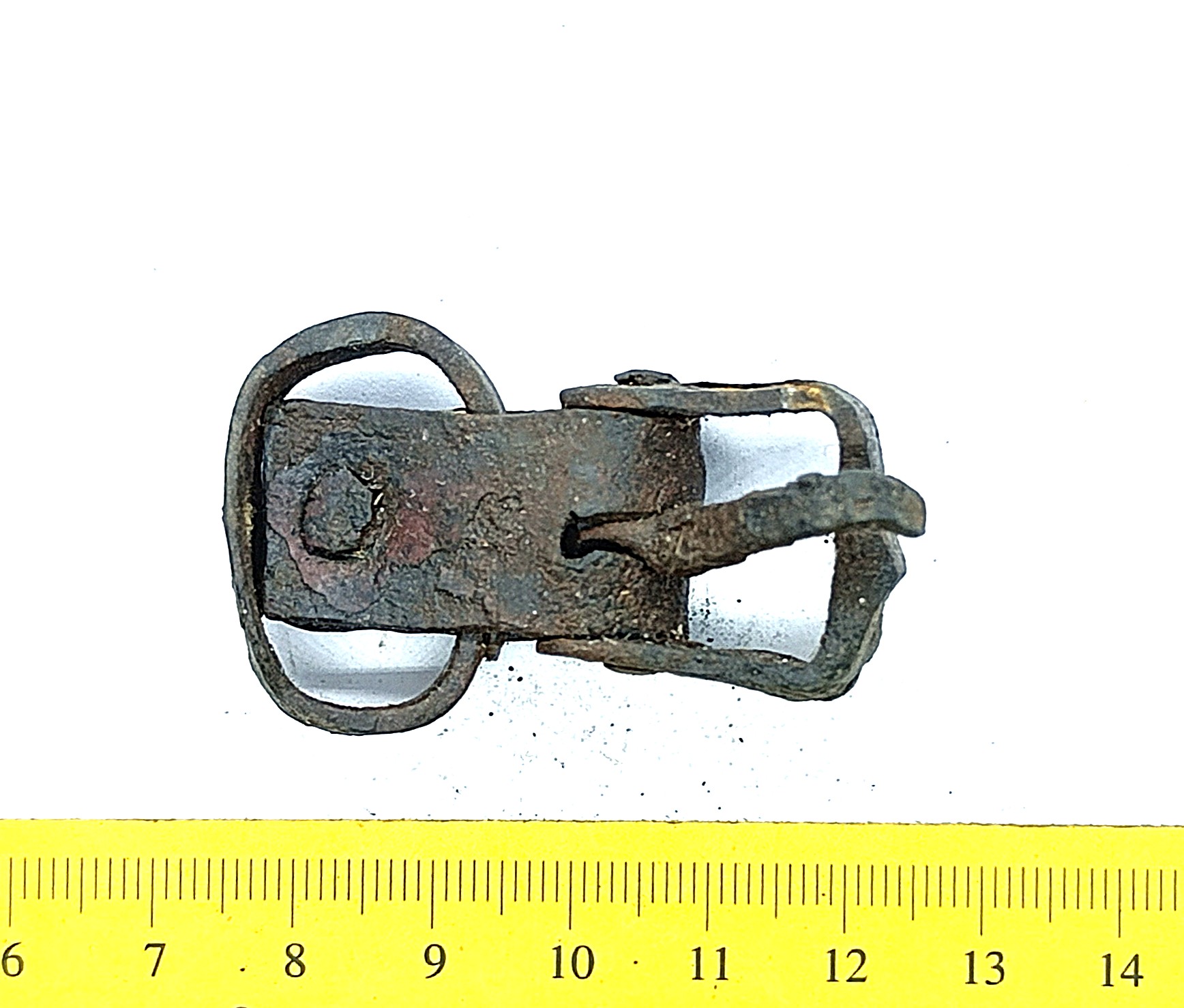 Gotland-Baltic type buckle, copper alloy. Previously the buckle type was believed to have developed in Gotland. Later data, however, shows that the buckle form could originate from the Baltics after which it was adapted in Gotland (Lehtsalo-Hilander 1982, 149–151; Mägi 2002, 97; for Gotlandic material see Thunmark-Nylen 1992, Pl. 127–129). The earliest buckles of this type belong to the second half of the 10th century, but the latest variants can also be found in the 13th-century inhumation graves (e.g. Zariņa 2006, 233-237). This specimen is probably the earlier variant.