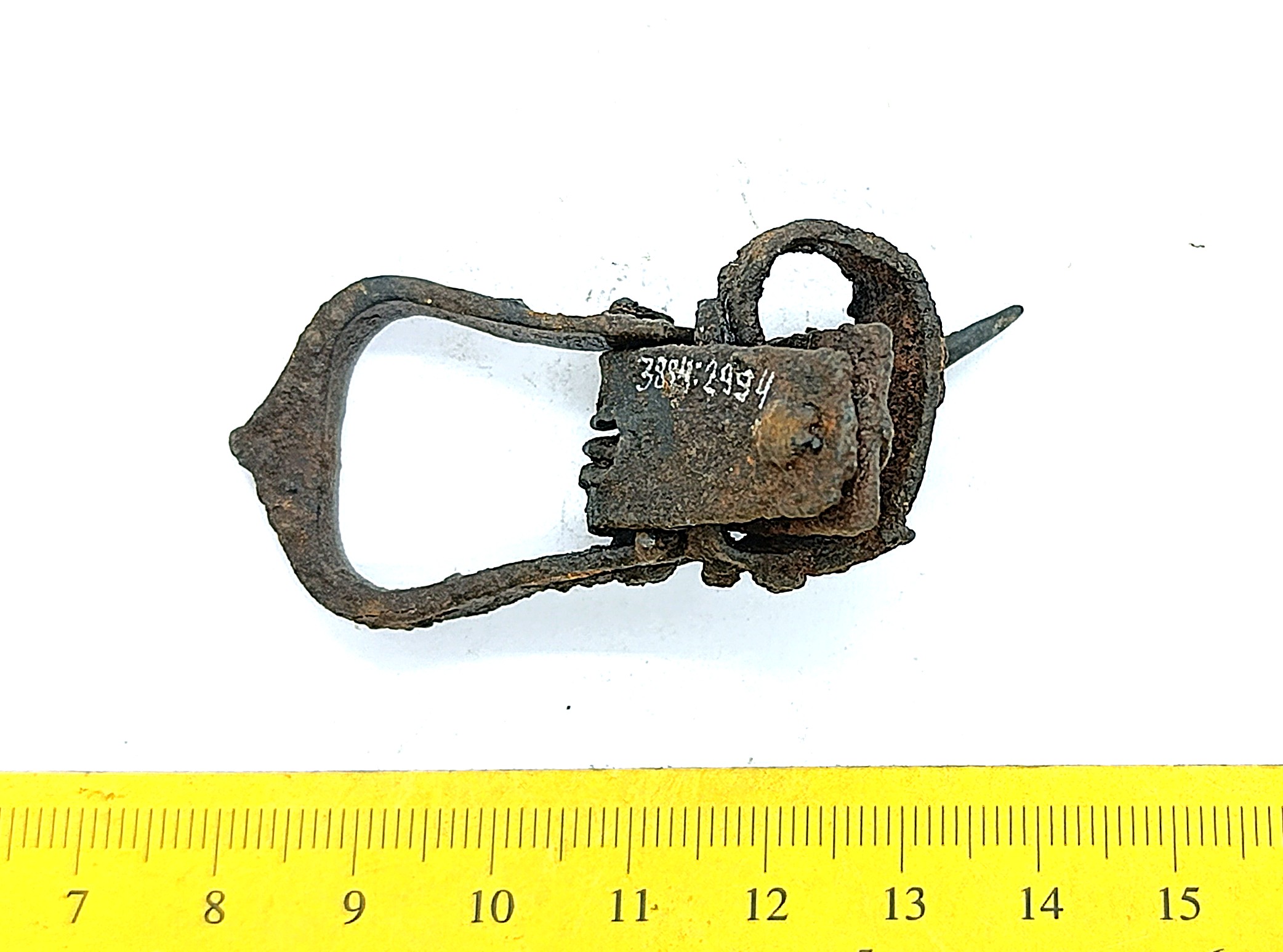 Buckle, iron. Perhaps part of bridles. This type of buckles usually includes a simple iron belt strap. They have been found mainly in stone graves and are not dated more precisely.