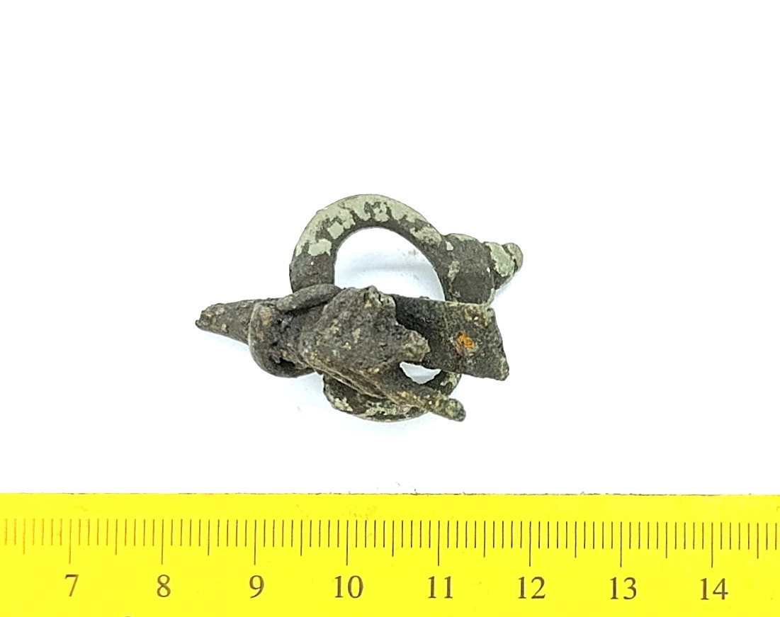 Gotland-Baltic type buckle, copper alloy. Previously the buckle type was believed to have developed in Gotland. Later data, however, shows that the buckle form could originate from the Baltics after which it was adapted in Gotland (Lehtsalo-Hilander 1982, 149–151; Mägi 2002, 97; for Gotlandic material see Thunmark-Nylen 1992, Pl. 127–129). The earliest buckles of this type belong to the second half of the 10th century, but the latest variants can also be found in the 13th-century inhumation graves (e.g. Zariņa 2006, 233-237). This specimen is probably the earlier variant.