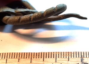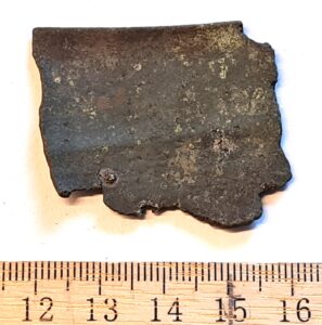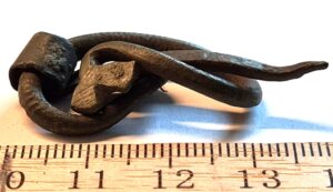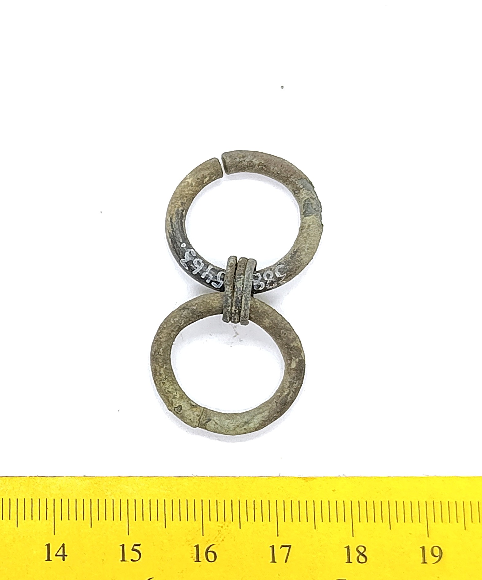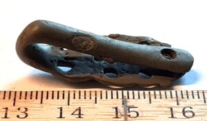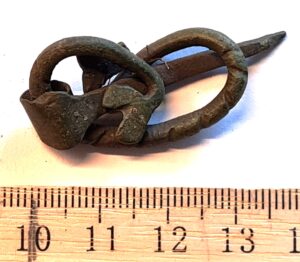 Belt-chain, copper alloy. The links of this belt-chain measure ~2 cm across and are held together by bronze links. Similar belt chains have been found in many Saaremaa inhumation burials dating to the 13th century, e.g. in Valjala (Mägi et al., 2019). Parts of belt-chains have also been found in stone graves with cremation burials where they can date to the 12th century.