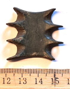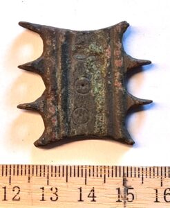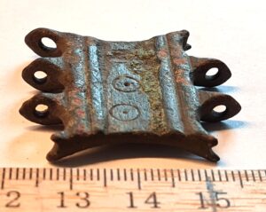 Chain distributer, copper alloy. From the 9th-13th century. Quadrangular chain distributors with protrusions are a typical component of the breast chains placed in the 13th-century inhumation burials of Estonian women, but they are also abundantly found in earlier stone graves and as stray finds. They have been discovered throughout areas inhabited by Baltic Finnic peoples, as well as elsewhere, for example in Semigallia. (Spirģis 2008, 168–170).