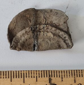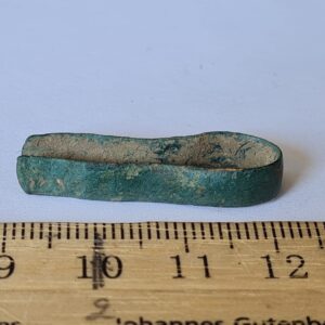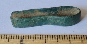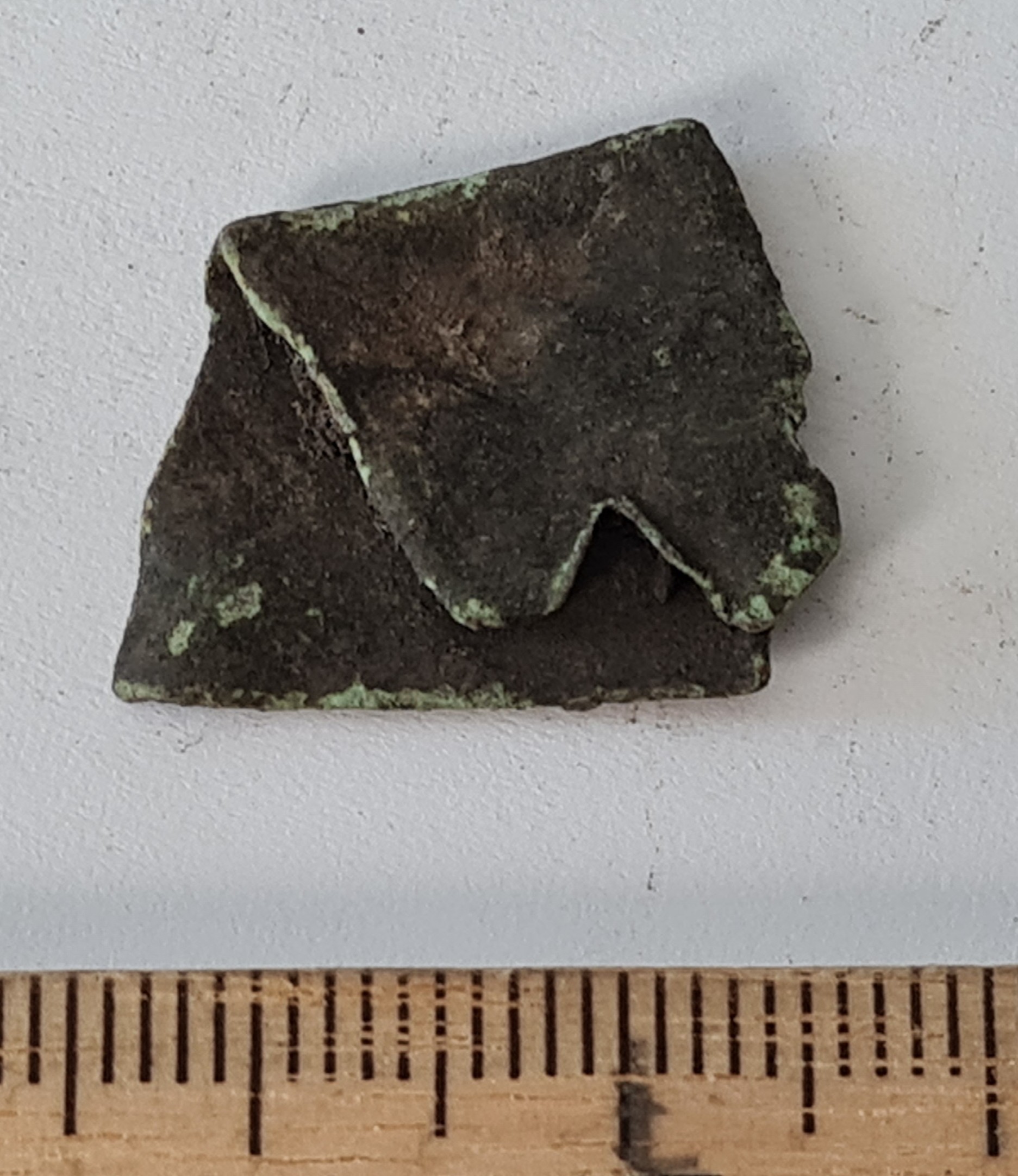Mount, copper alloy. Bent double; one end is saw-edged, but it is not a typical saw-edged mount. More precisely undetermined.