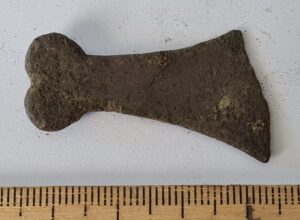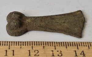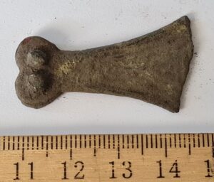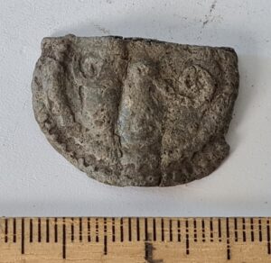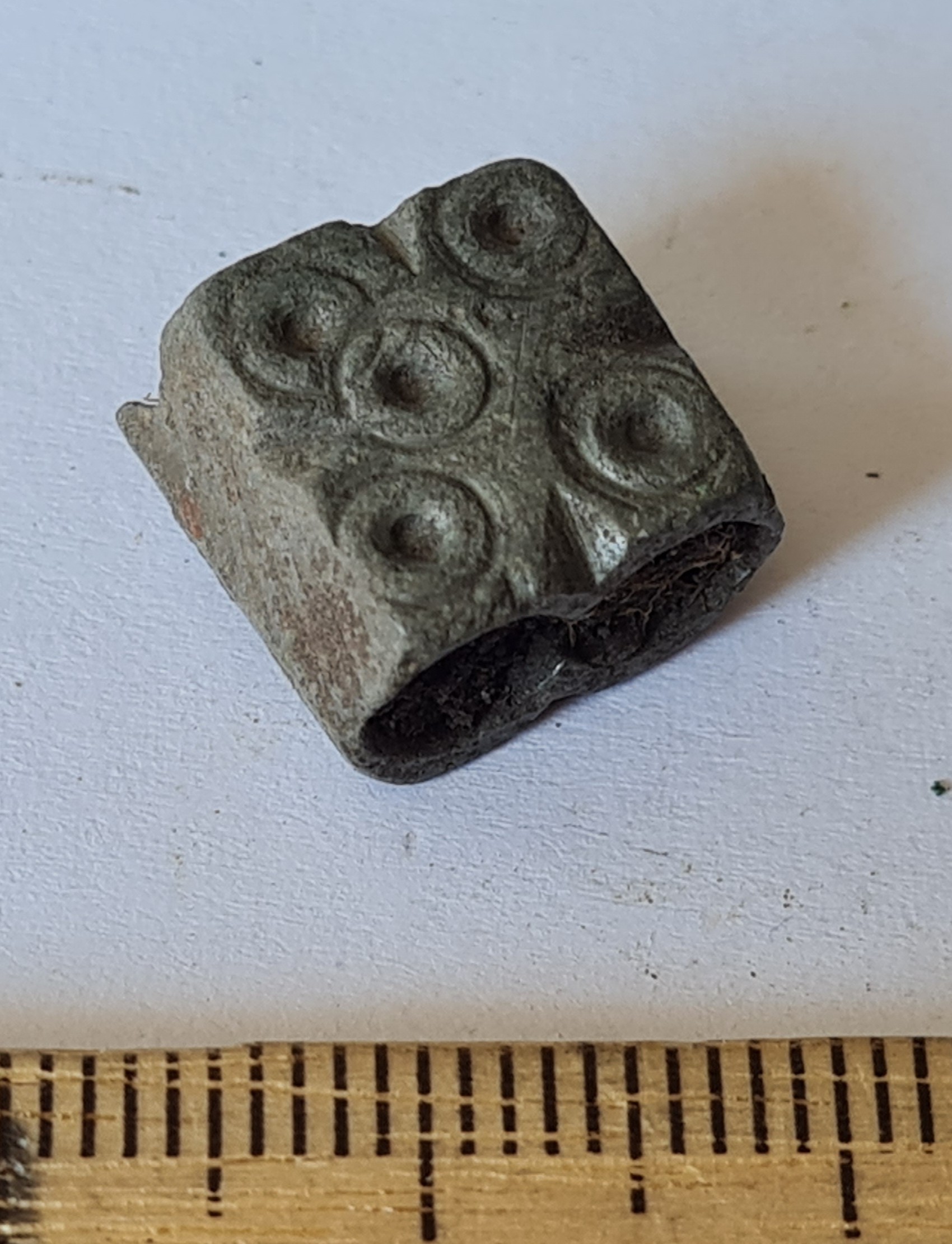 Cubic chain distributer, copper alloy. Chain distributors held together belts composed of metal rings, which have been found in several 13th-century inhumation burials, for example at Valjala (Mägi et al. 2019, 98–99). Such chain belts have been recovered mainly from women’s and children’s graves, and both the chains and the associated cubic chain distributers have been dated to the 12th–13th centuries (Kurisoo et al. 2023, 220–221).