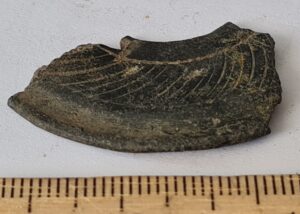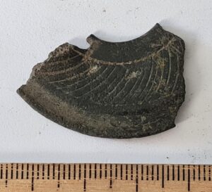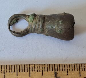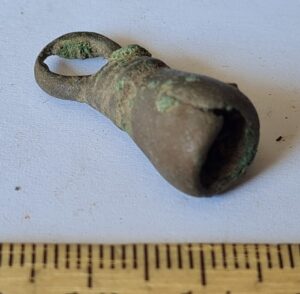 Bell-shaped pendant, copper alloy. At Siksälä, such examples occur in burial CCXLIV, which has been dated to the 14th century, primarily to the first half of the century (Valk et al. 2014, 258–261).