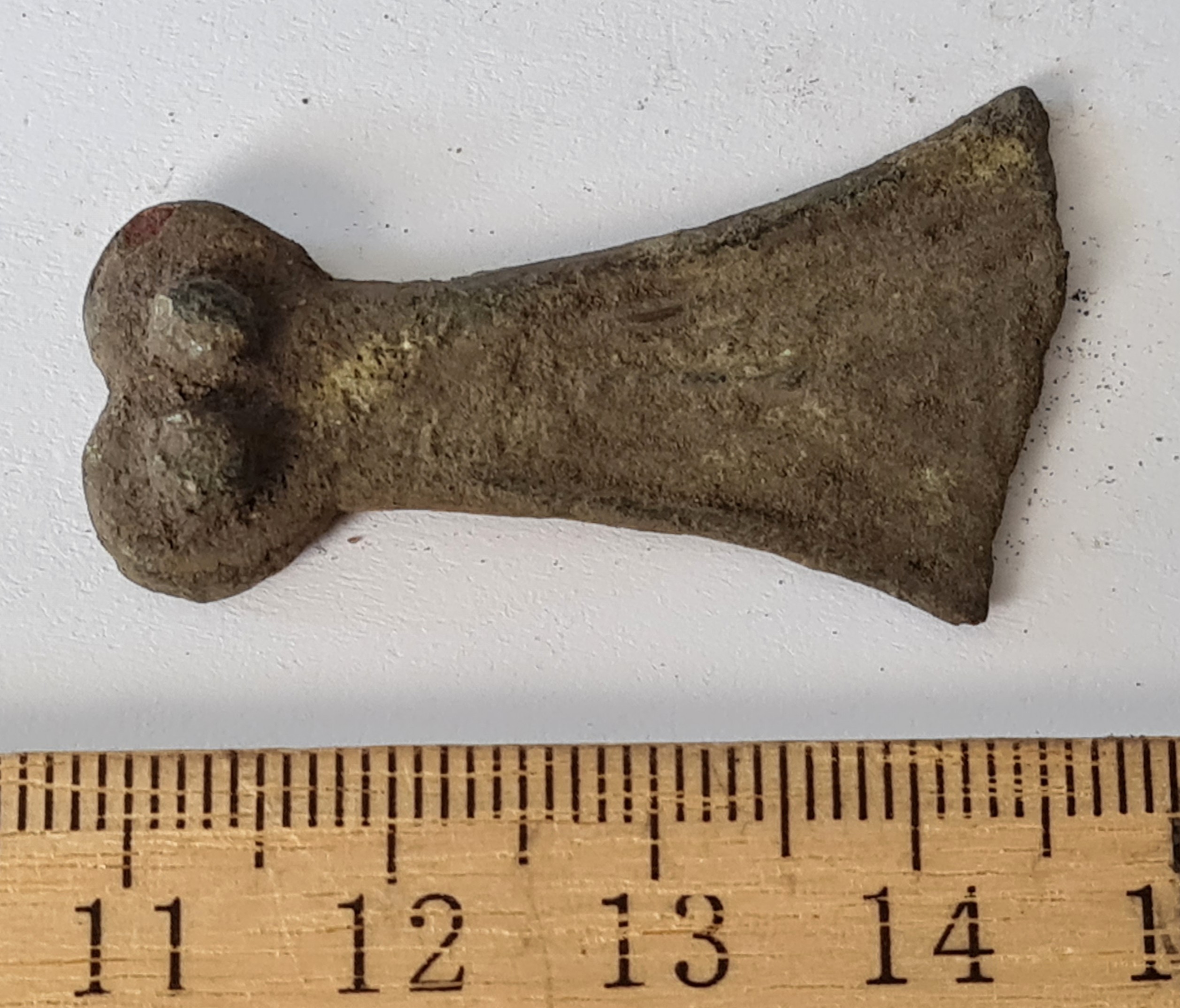 Fragment of pin, copper alloy. Saaremaa type flat triangular-headed pin.