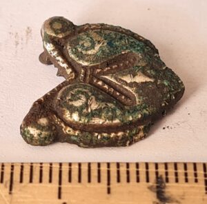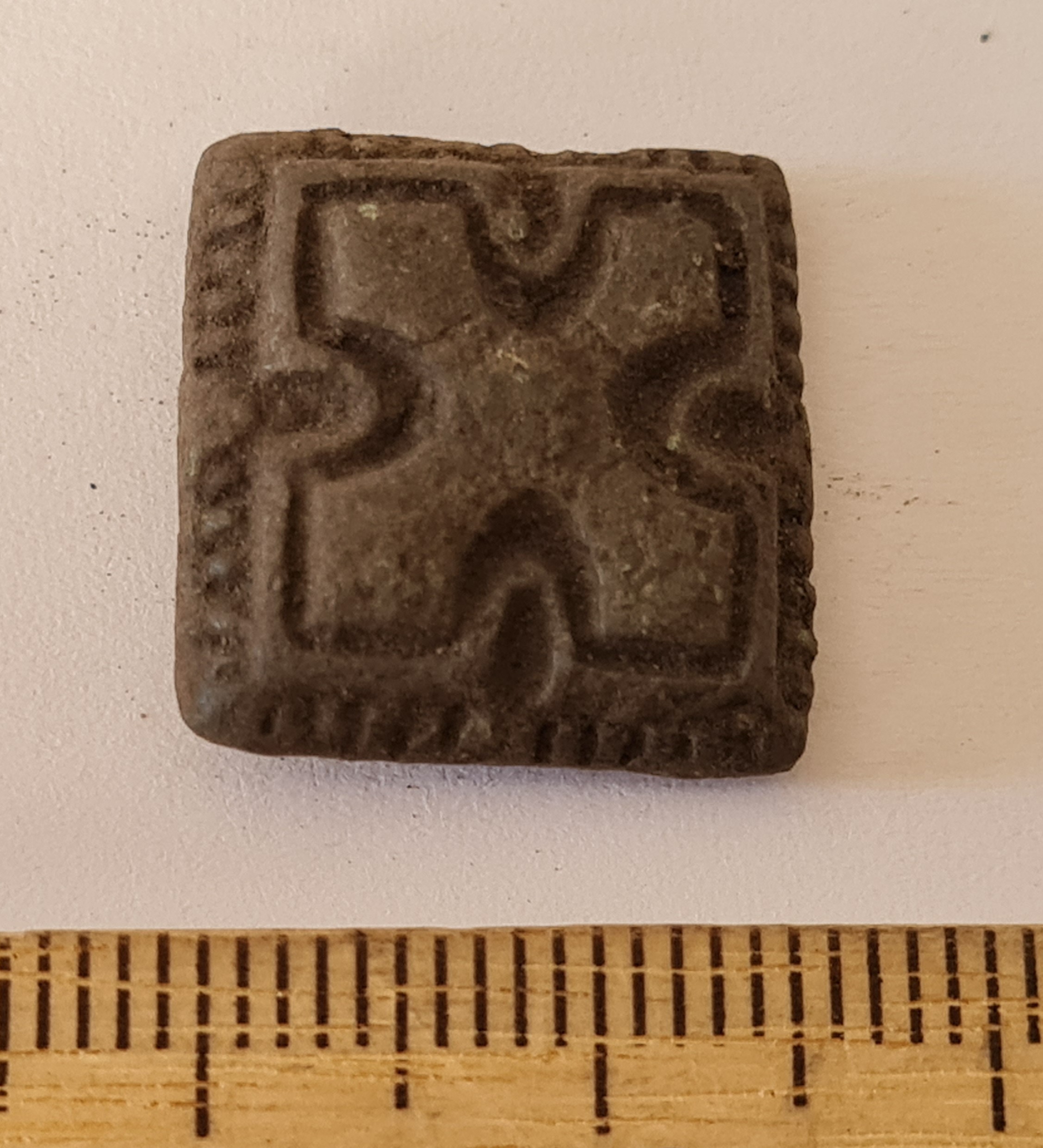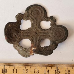 Belt mount, copper alloy. Square-shaped mounts with cross-motifs are very widespread in Estonian stone graves with cremations (Mägi 2002, 96-99; Mandel 2017, 83, tahv XLII).They have been often found together with Gotland-Baltic type buckles and animal style joining mounts (e g Lehtsalo-Hilander 1982, 154).