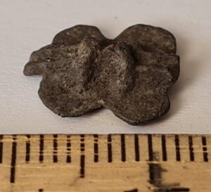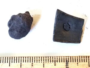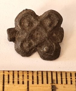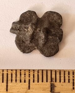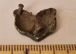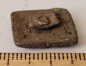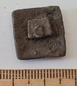 Cubic chain distributer, copper alloy. Chain distributors held together belts composed of metal rings, which have been found in several 13th-century inhumation burials, for example at Valjala (Mägi et al. 2019, 98–99). Such chain belts have been recovered mainly from women’s and children’s graves, and both the chains and the associated cubic chain distributers have been dated to the 12th–13th centuries (Kurisoo et al. 2023, 220–221).