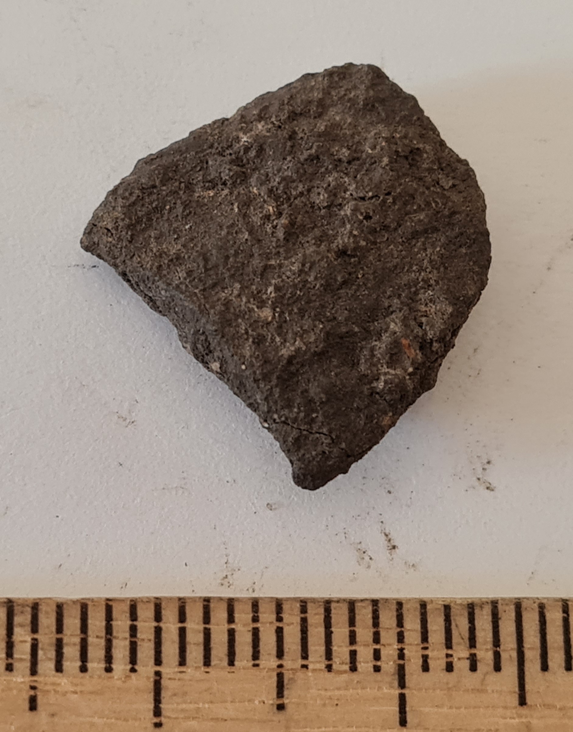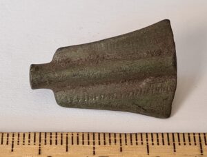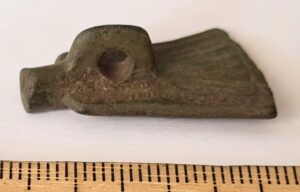 Fragment of Saaremaa type flat triangular-headed pin, copper alloy.