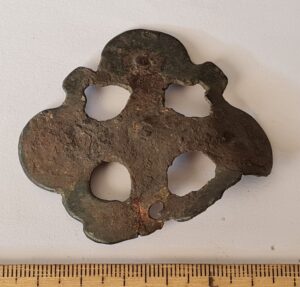 Two fragments of artefact, copper alloy. One of them is the base-plate of mount.