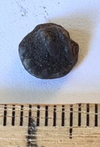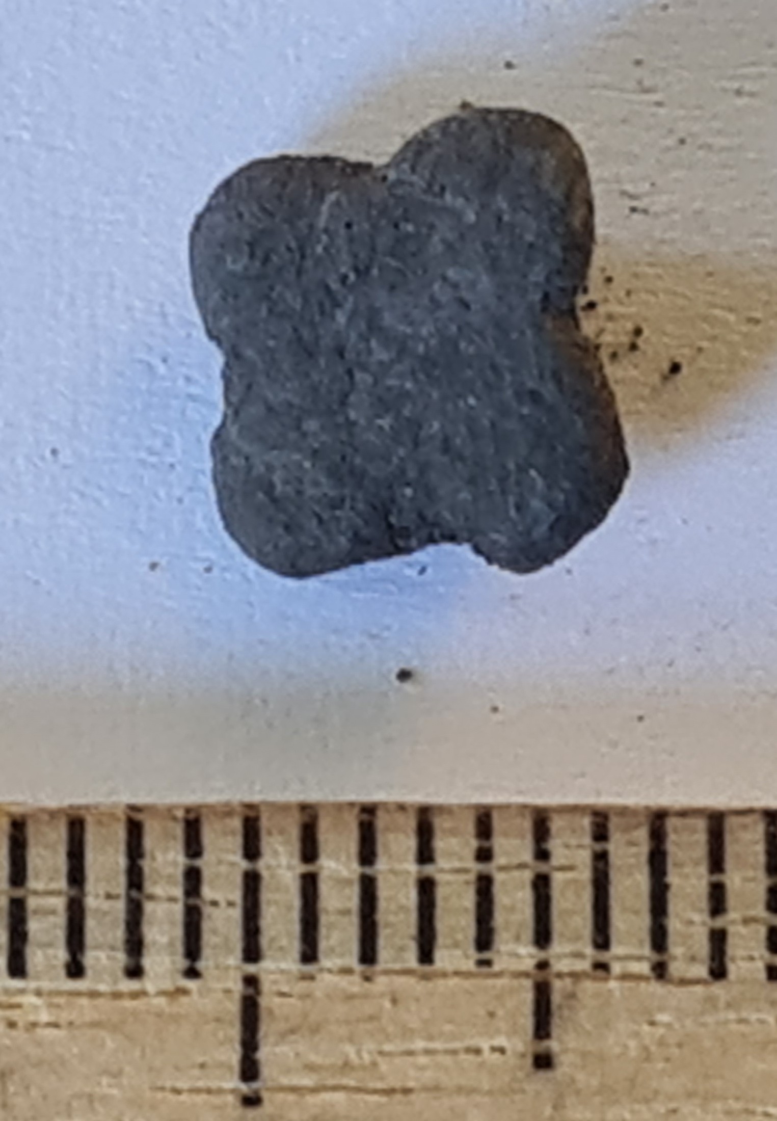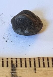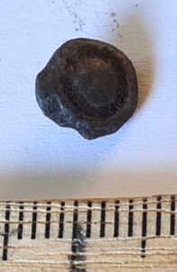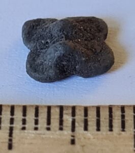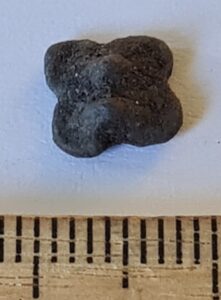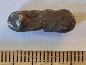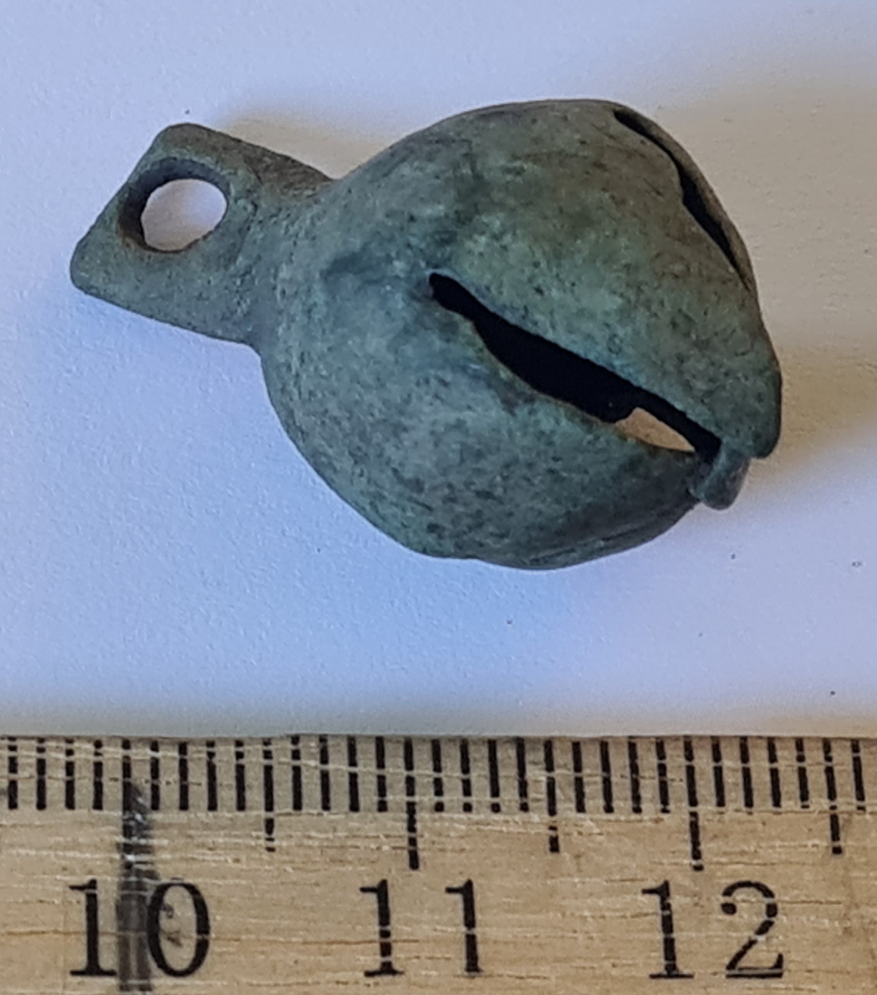 Bell, copper alloy. Four-lobed, plain, with a square suspension loop. Such bells have been found in large numbers, for example at the Siksälä cemetery, where they are mostly dated to the 14th century and occasionally also to the 15th century (Valk & Laul 2014, 110; Valk et al. 2014). They are also known from Courland, for instance from the Vilkmuiža burials at Dundaga (e.g. Muižnieks & Žeiere 2021, 321). They were worn both as parts of necklaces and, in the case of men, for example as buttons. Bells of this shape are also abundantly known from the Muhu settlement site.
