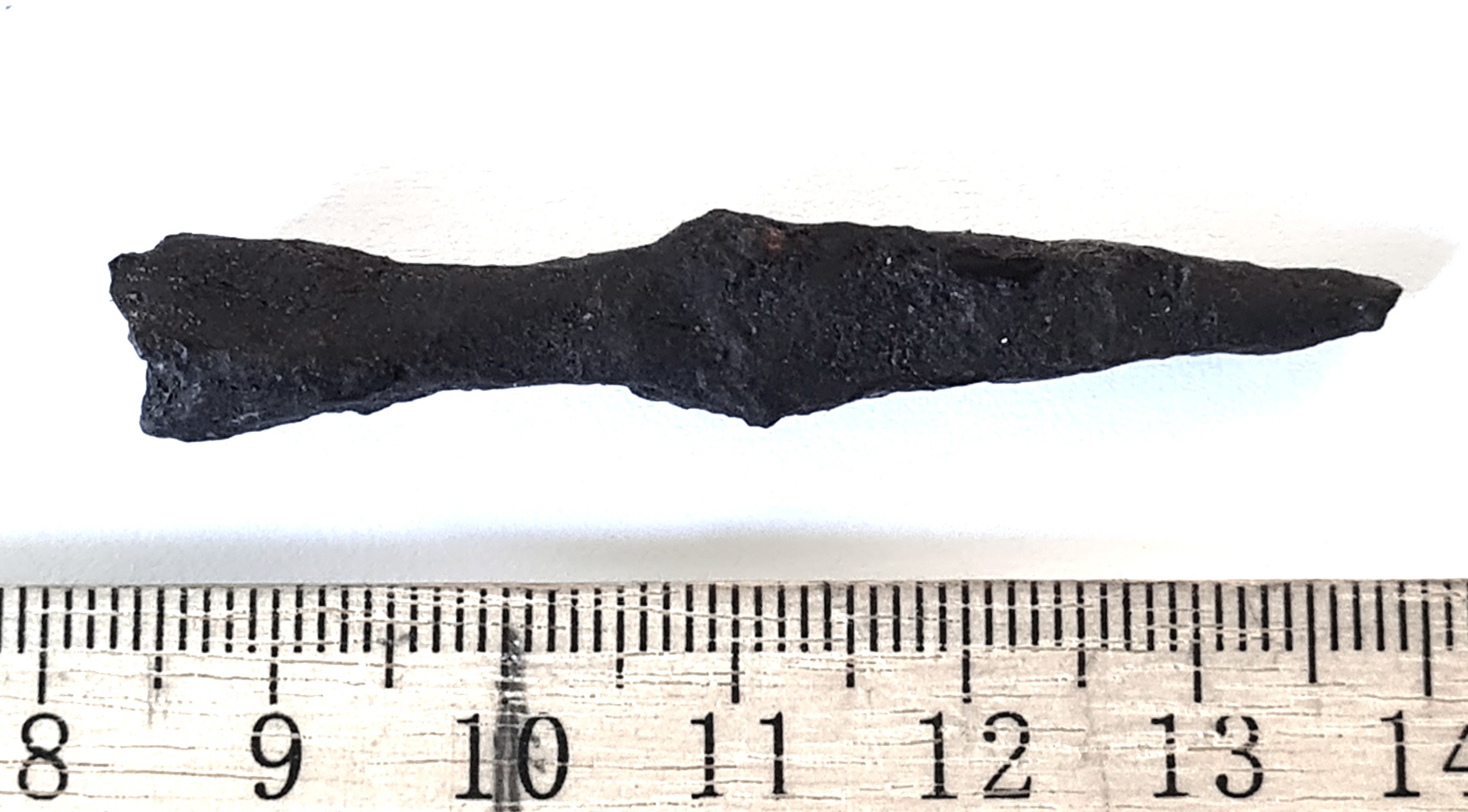 Arrow-head, iron. Most likely crossbow bolt. With a pyramidal head, the greatest width at the base of the blade where it transitions to the socket – Mäesalu type A I. Comparable examples have been found, for instance, at the Varbola hillfort (e.g. AI 3864: 1; 5299: 23, 305). Crossbows came into use in the Baltic region already at the very end of the 12th century, but heads of the present type are dated in Estonia mainly to the first half of the 13th century (Mäesalu 1991). In Latvia, such crossbow bolt heads are dated from the late 12th century to the early 14th century (Mugurēvičs 2008, 202).