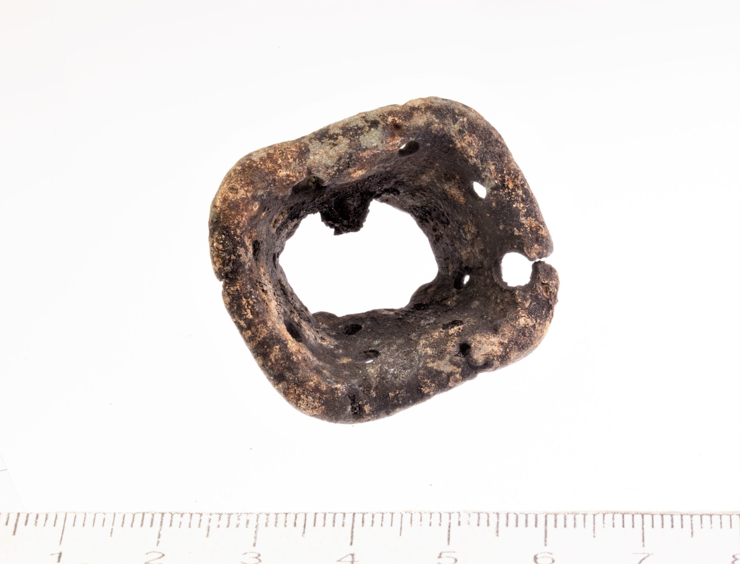 Penannular brooch with faceted terminals, copper alloy. Pin missing, one end broken. With a rhomb-shaped cross-section of the ring, the ring decorated with “wolf-teeth” ornament. Such brooches were widespread in Estonian stone graves (see e.g. Pauts 1997, 197; Mägi 2002; Mandel 2017), but also occurred in inhumation graves, and can be dated up to the the mid-13th century.