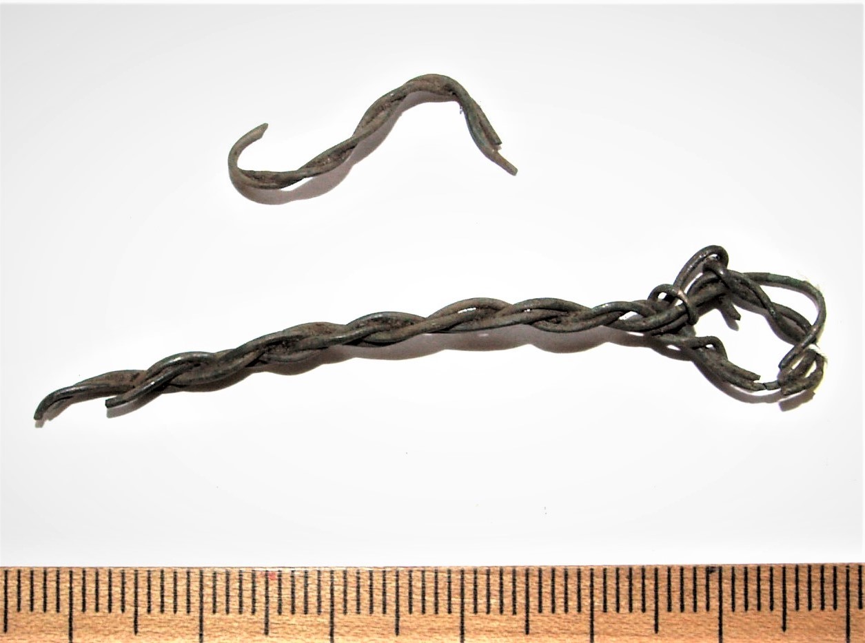 Buckle, bronze. Typical female belt buckle with round front part. Such buckles were in both ends of the belt and were fixed with, for instance, iron or bronze hook. This type of buckles occur often in 13th-century inhumation burials in Saaremaa and coastal Estonia (Mägi et al. 2019, 97; Lõhmus et al. 2018), but sometimes also in cremations at stone graves (Mägi 2002, 99, P. 139: 1).