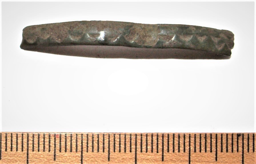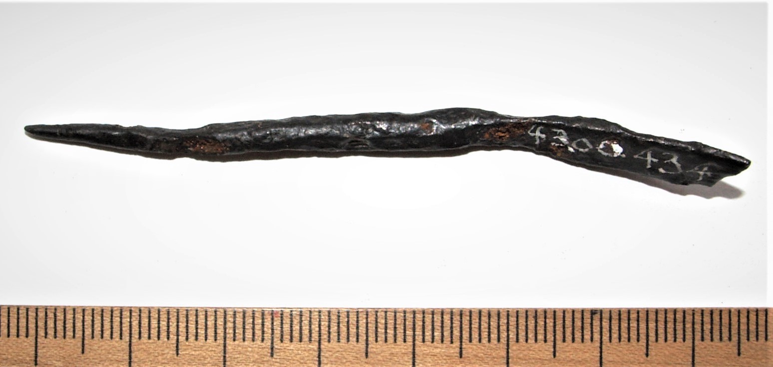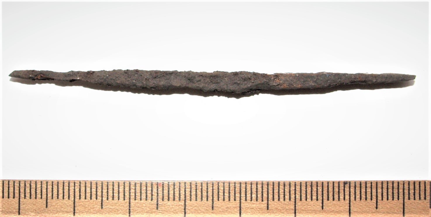 Iron crossbow head. Such heads have been found in several medieval castles and in 2012 also from Haapsalu (Russow & Allmäe 2013). Mäesalu has dated such crossbow-heads in Estonia to the first half of the 13th century due to some finds in hill-forts, what he associates with sieges known from written sources (Mäesalu 1991, 174-175). Such crossbow-heads in Latvia have been dated to the second half of the 13th century and the first half of the 14th century (Mugurēvičs 2008, 192, 202, Griciuvienė 2005, 202), in Russia to the 13th-15th century (Medvedev 1966, 116, Pl 31: 28).