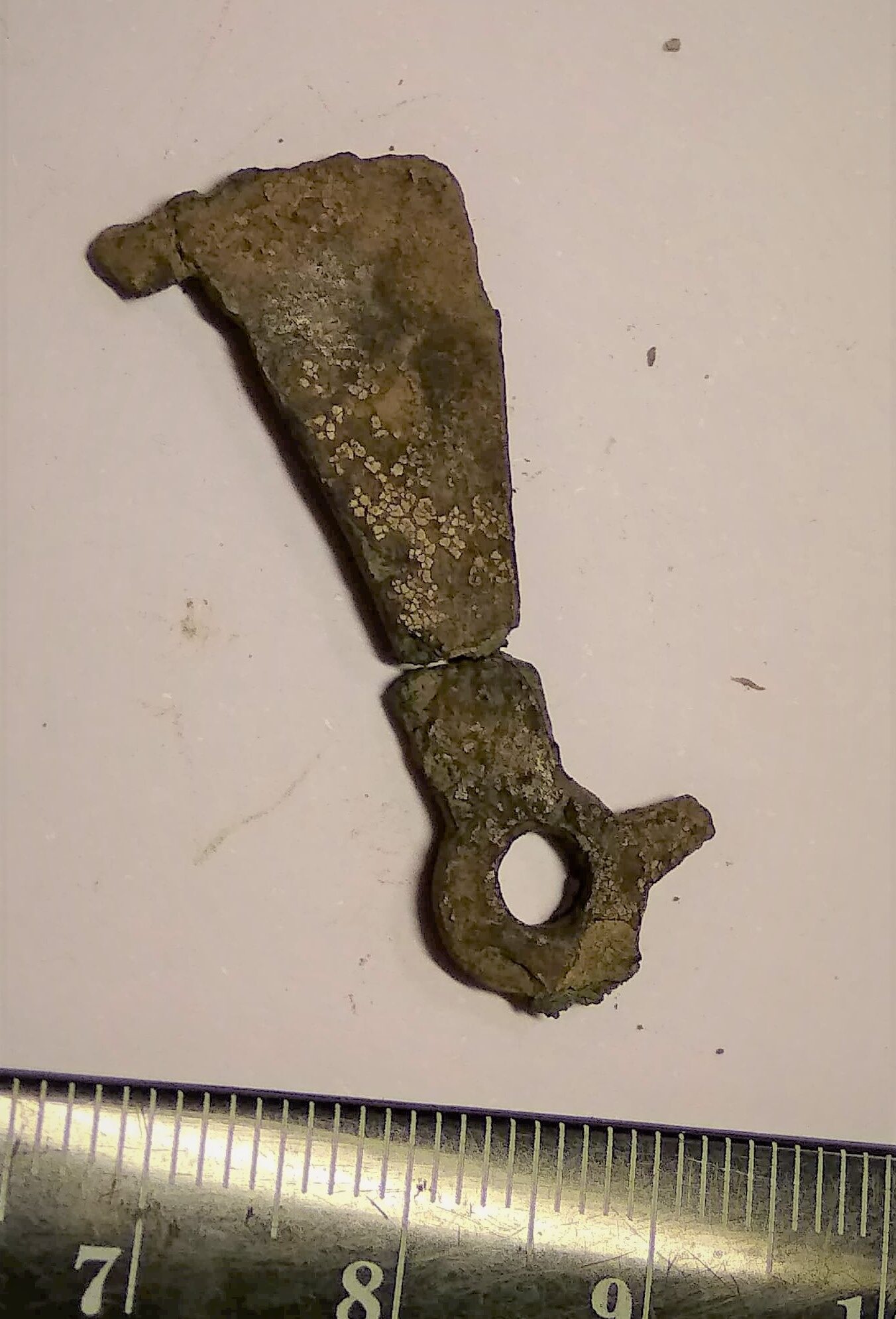 Fragment of a penannular brooch with lily-shaped terminals, copper alloy. Twisted ring. Somewhat similar brooch was found in burial No 1 at Valjala churchyard in 1971 (Mägi et al 2019). Based on the shape of the ring, as well as similar brooches in inhumation graves in Couronia and in St Peter’s churchyard in Riga, the brooch can be dated to the 13th-14th century, although similar types were used until the third quarter of the 15th century (Vaska 2017, 62-64).