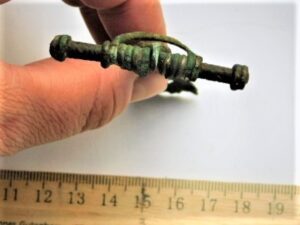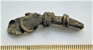 Crossbow brooch fragment, silver and bronze. The upper part of the arc of the brooch. There used to be a silver ring garniture on the neck. Probably there have been two silver ring garnitures with a triple bronze(?) set between them, lower than the previous one. The fractured cross-section of the neck is square, head is flat.