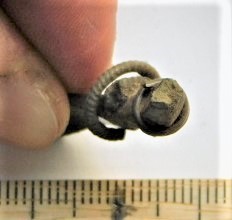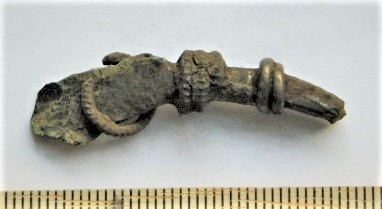 Crossbow brooch fragment, silver and bronze. The upper part of the arc of the brooch. There used to be a silver ring garniture on the neck. Probably there have been two silver ring garnitures with a triple bronze(?) set between them, lower than the previous one. The fractured cross-section of the neck is square, head is flat. The brooch may belong to the 3rd century, but more likely to the 4th-5th century (Rohtla 2005, 126-127).