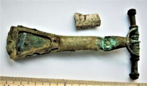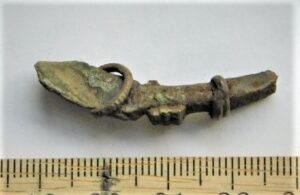 Crossbow brooch, bronze + silver + iron, and a fragment of burnt pipe bone. Triangular foot. The brooch has a small spring cord with relatively long knobs with ring decoration extending to either side. It has a flat arc and the foot is flat, shaped into a trapezoid. On the top of the foot was a silver plate which had been fastened with two pins. The back of the leg had a remnant of bronze mount, with a small bronze rivet attached to it – probably a pinhole had been attached to the leg with bronze mounts. The needle is missing.
