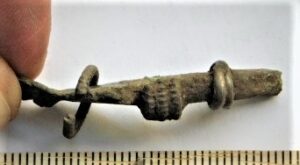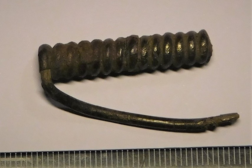 Crossbow brooch fragment, silver. A spiral coil wound around an iron rod with the fragment of a spring cord. The silver spring cord cross-section is otherwise rounded, but flattens out at the end of the cover – it must have been attached to an arch. It might belong to the Roman Iron Age.