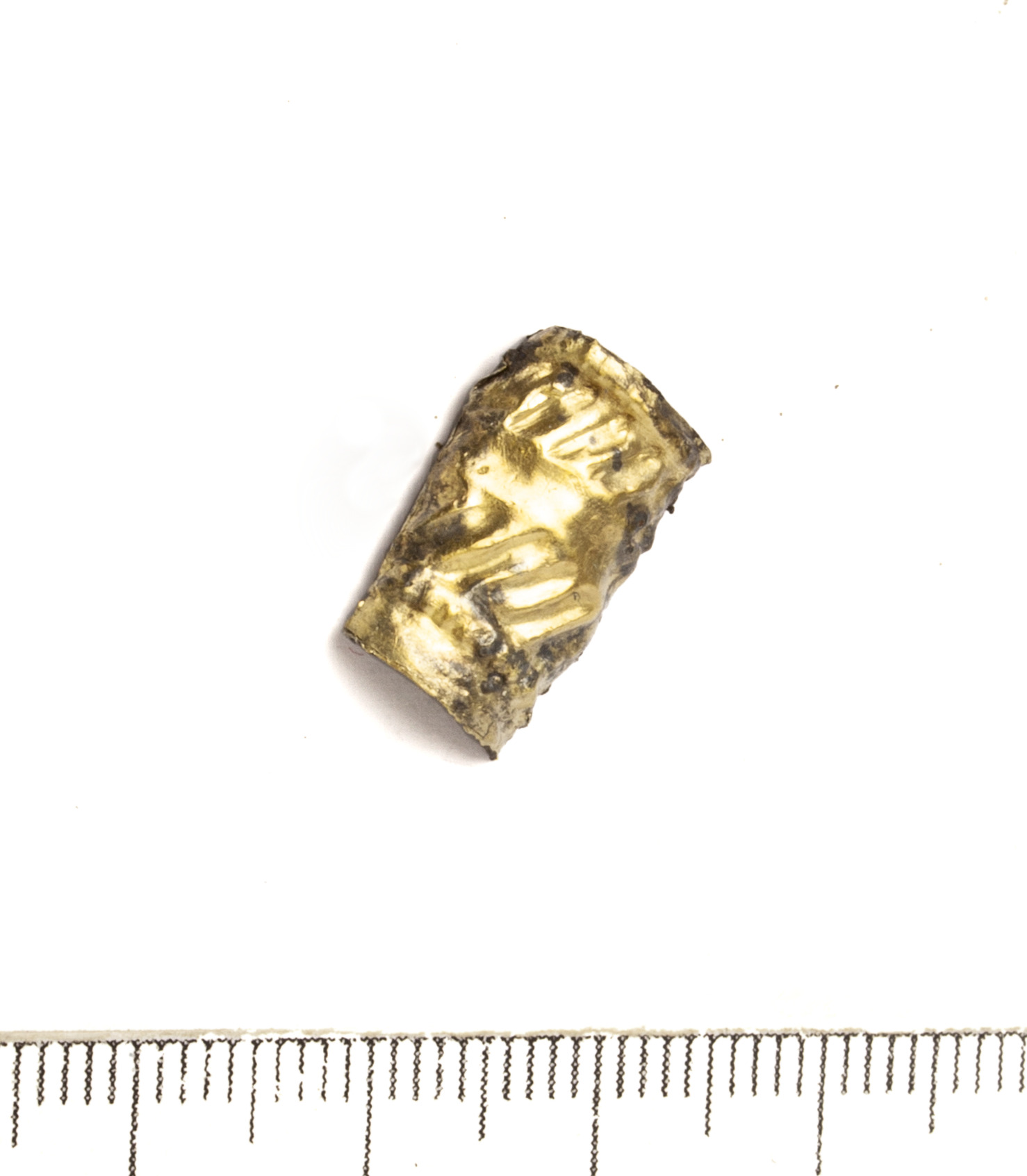 Piece of gold plate from a crossbow brooch (?), most probably from the arc. Embossed ornament with two zones of buttons and two zones of slashes between them. Ornament is similar to that of brooch nr SM10862:18.