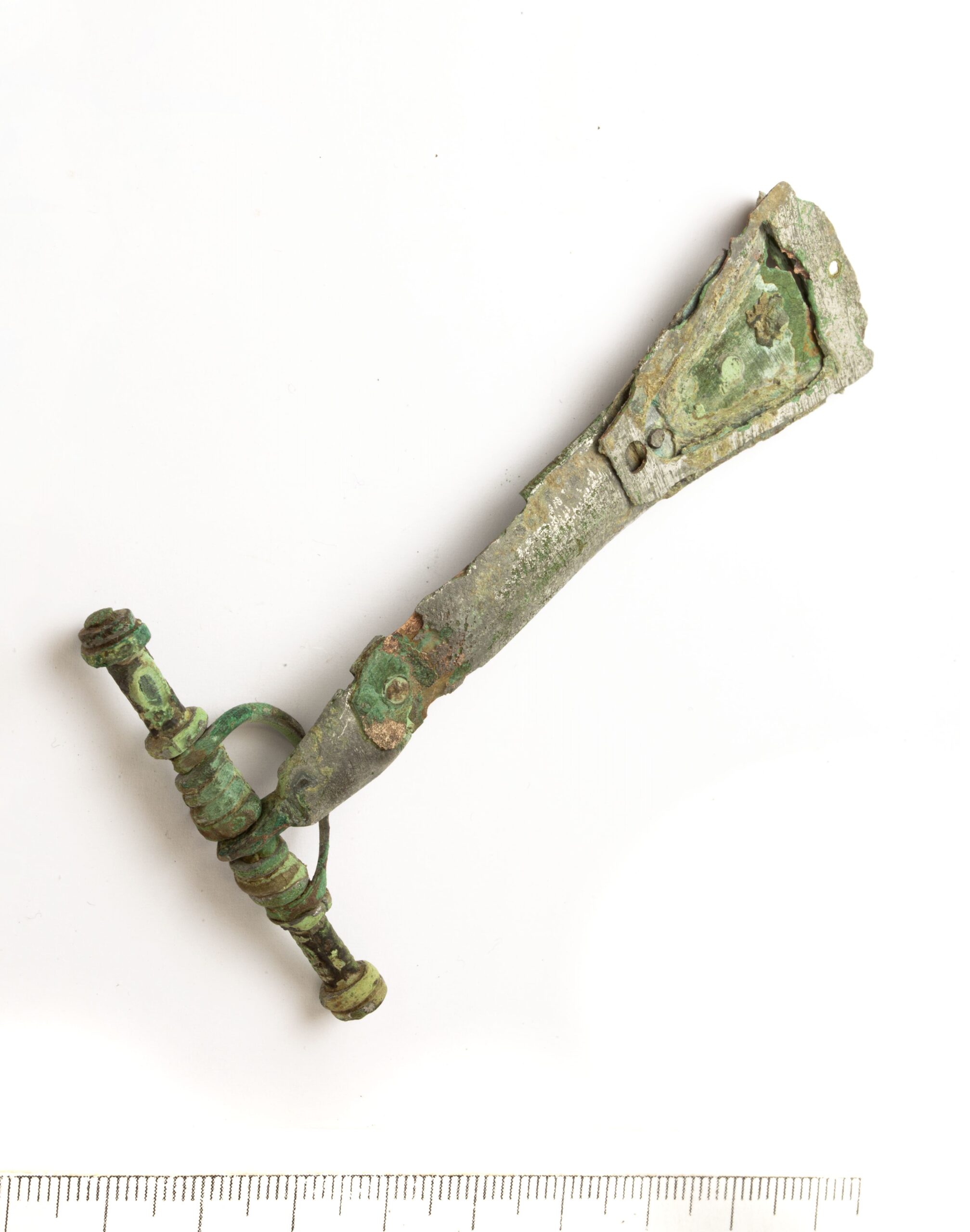 Pin of the brooch, bronze or silver. It might have belonged to a similar brooch as SM10862:51. The part of the head is twisted into a loop and between this loop there seems to be an iron residue, i.e. a remnant of the spiral axis.