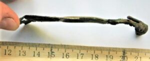 Iron fragment (of a spearhead socket?). A curved plate. In that case, the diameter of the socket would be around 2.5 cm.