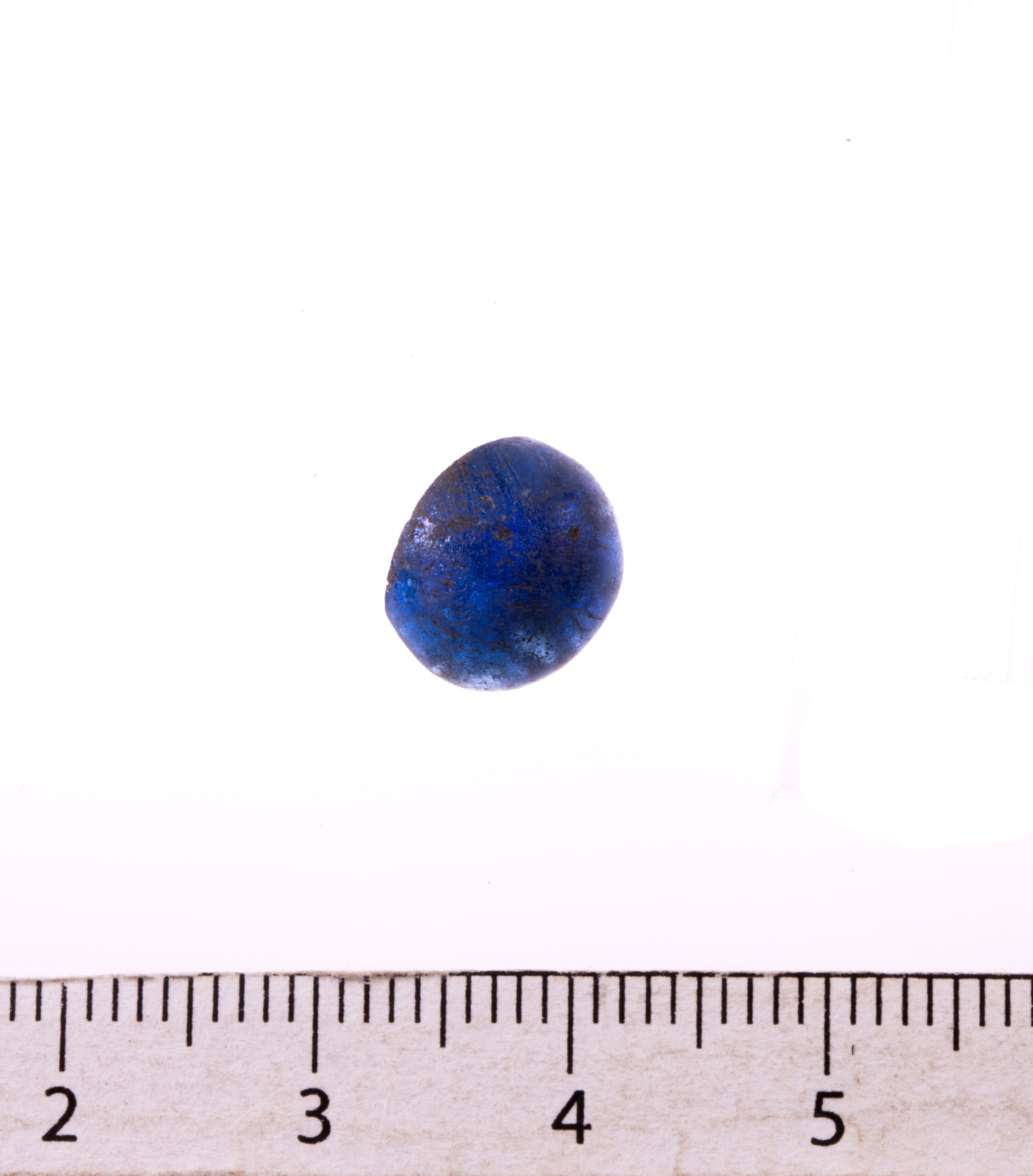 Bead. Blue glass and spherically shaped.