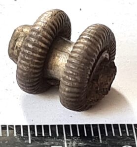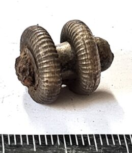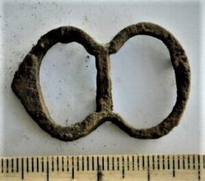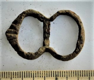 Fragment of crossbow brooch, iron and silver. A double ring set with an iron bar inside, plated with silver.