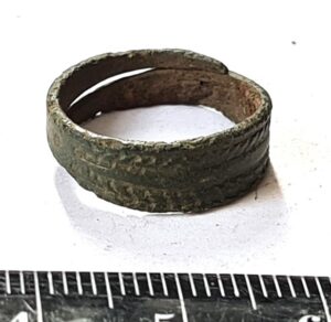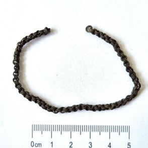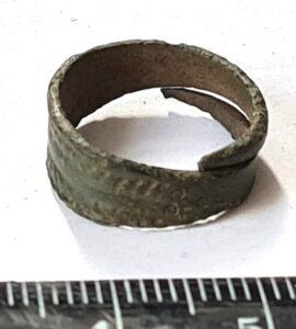 Finger ring, bronze. Open, with flat front part. The front part has a side ornament made out of intertwined lines. Rings of this type are common in Estonian stone graves. In Gotland they have been dated to the 10th-12th century (Thynmark-Nylén 1998, Taf 143: 24-28; 2006, 158), which is probably also correct for Saaremaa.