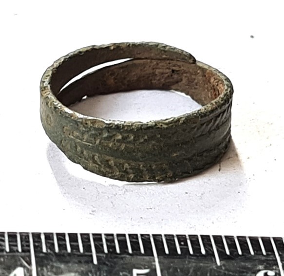 Finger ring, bronze. Open, with flat front part. The front part has a side ornament made out of intertwined lines. Rings of this type are common in Estonian stone graves.