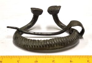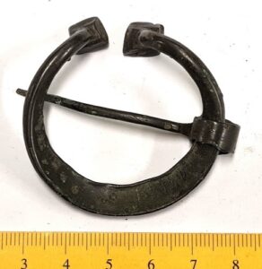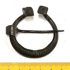 Penannular brooch, copper alloy. Knob-shaped terminals. The loop has grooved thicker middle parts transversely grooved. Similar brooches are often found in 13th-14th-century inhumation graves and only seldom in stone graves with cremations. In Karja, such brooch was registered in an inhumation dated to the second half of the 13th century (Mägi 2002, Pl. 125: 1–2), but in Siksälä, South-East Estonia, they also occur in 14th-century graves (Valk et al 2014).