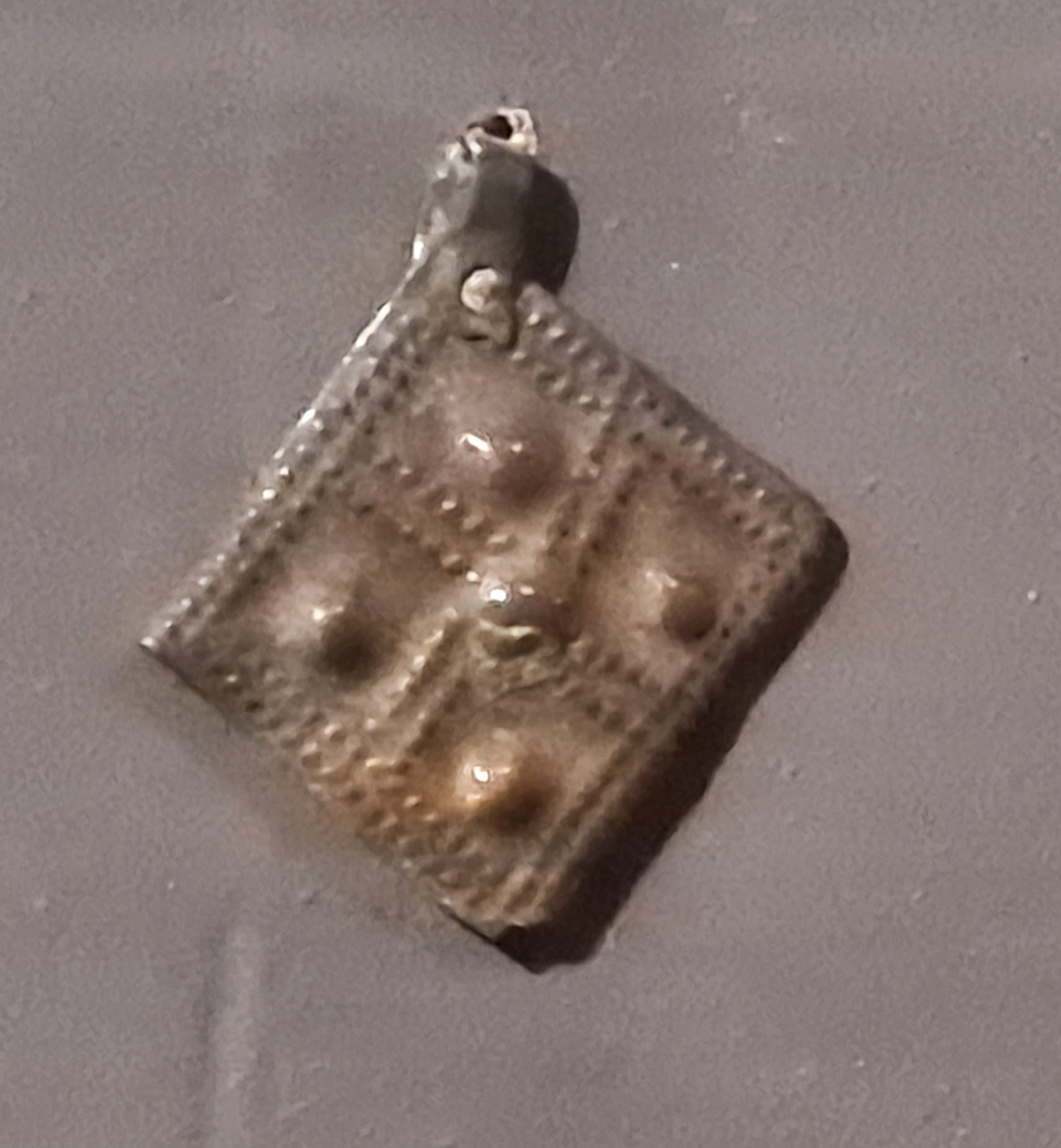 Rhombus-shaped pendant, copper alloy. Such pendants are often found in Estonia, Latvia and Lithuania and are dated from the 13th century (or the mid-13th century) to the 15th century (Valk & Laul 2014, 111-112 and references).